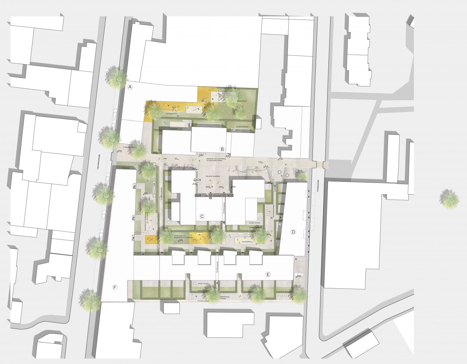 Im Innenhofbereich und entlang der südlichen Zuwegung befinden sich die für die Außenanlagen vorgeschriebenen 76 Fahrradstellplätze. Die Beleuchtung der öffentlichen Fläche erfolgt über Leuchtstelen, die der halböffentlichen Bereiche über Pollerleuchten. Im Innenhofbereich sind Bänke als Sitzgelegenheiten vorgesehen.