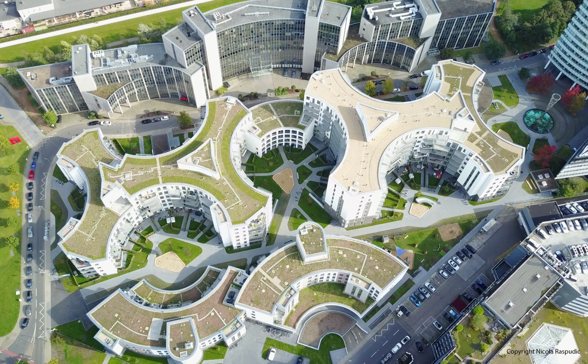 Über 300 Wohneinheiten sind in dem alten Headquarter von Thyssen entstanden. Neben den neuen Balkonen, von denen man die Außenanlagen wie ein Bühnenbild, dass sich dank der dezentralen, privaten Kleinkinderspielbflächen mit Leben füllt, betrachten kann, waren Brandschutz und Statik eine große Herausforderung bei der Planung. Damit keine betonierten Zufahrten entstehen, wurden die großen Flächen für die Feuerwehr mit Schotterrasen angelegt. So sind die Freianlagen zum grünen Bett geworden, auf dem die Gebäude stehen – es muss nicht viel Grün im urbanen Raum sein, dafür aber gut gemacht!