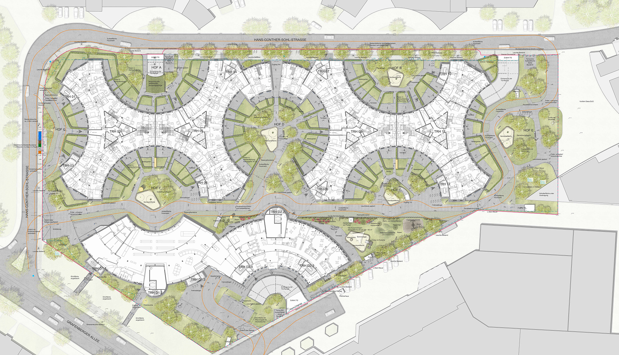 Beim Living Circle wurde die außergewöhnliche Architektur der Gebäude mit runden Formen und unterschiedlichen Gebäudehöhen auch in den Innenhöfen sichtbar gemacht: Die Mietergärten der Town Houses sind unterschiedlich tief, in den öffentlichen Bereichen wurde eine lockere, parkähnliche Bepflanzung mit mehrtriebigen Bäumen und Sträuchern wie Kirschen, Felsenbirnen oder Hartriegel gepflanzt. Es gibt keine Staudenflächen dafür viel Rasen. Bäume und Sträucher stehen leicht erhöht, da die Anlagen auf der Tiefgarage aufsetzen. Die Wege sind mal enger und mal breiter – jeder der sieben großen Außenbereiche ist unverwechselbar.