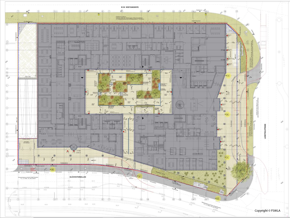 Die öffentliche Grünfläche zur Südtangente wird mit heimischen Sträuchern und Stauden bepflanzt. Am Kreuzungspunkt der Landteilstrasse / Glücksteinallee auf dem Grundstück des Bauvorhabens ist eine mehrstämmige Japanische Zelkove zur Betonung der signifikanten städtebaulichen Ecksituation des neuen Bürogebäudes vorgesehen.
