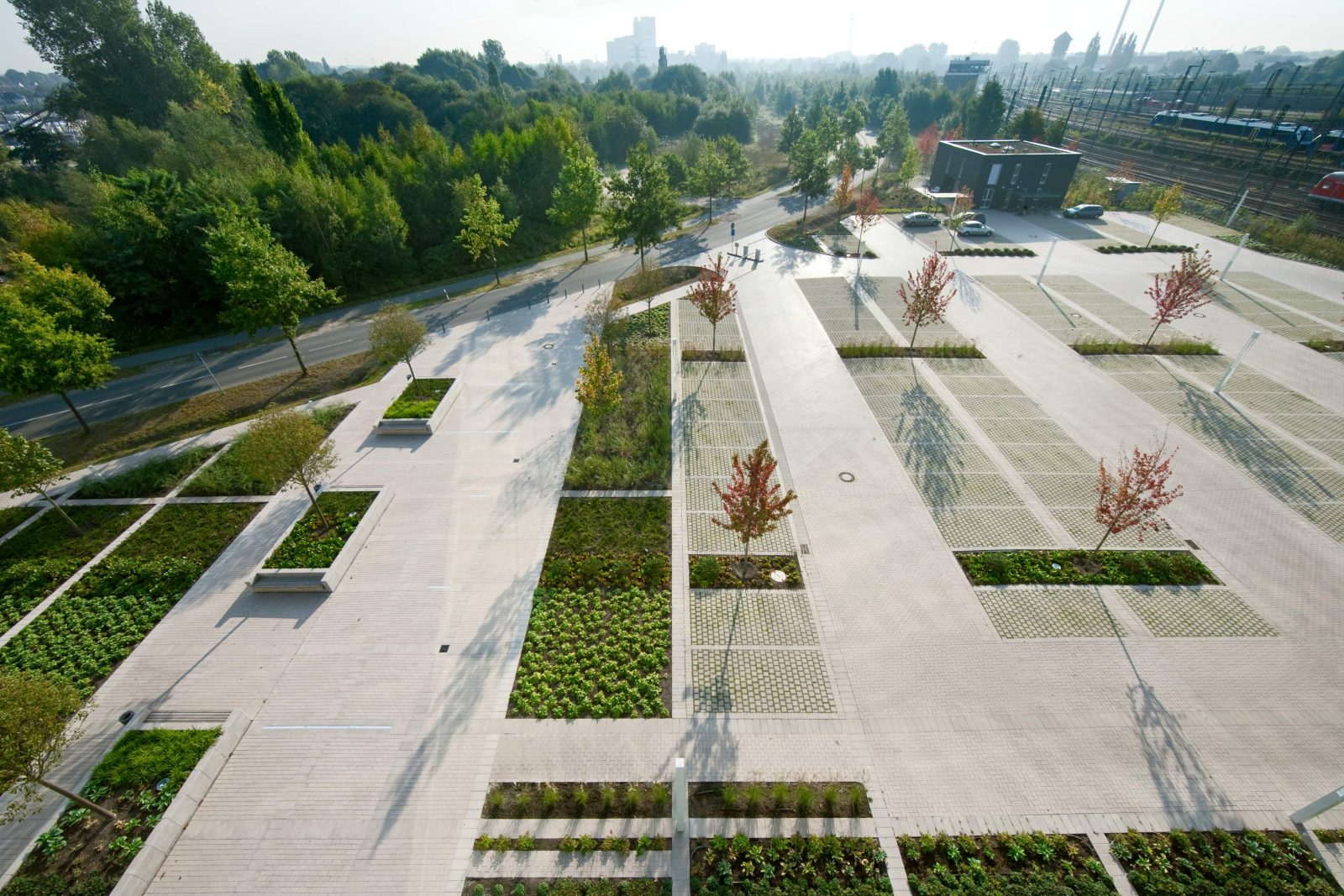 Ein Raster aus Streifen, Feldern und Flächen erstreckt sich nun über das Gelände. Schmale und breitere Streifen, wie sie sich auch in der umliegenden Kulturlandschaft wiederfinden, strukturieren die Grünflächen. Additive Sequenzen aus Gräsern, Sträuchern und Stauden erzeugen ein spannungsreiches Gesamtbild. Kontrast und Abwechslung überall: So kontrastieren die harten Kanten der Belagsflächen mit den weichen Linien der Blattschmuckstauden in variablen Grüntönen. Die Belagsflächen aus Naturstein variieren wie die Streifentextur. Hier werden Pflasterflächen mit Plattenstreifen verwoben.