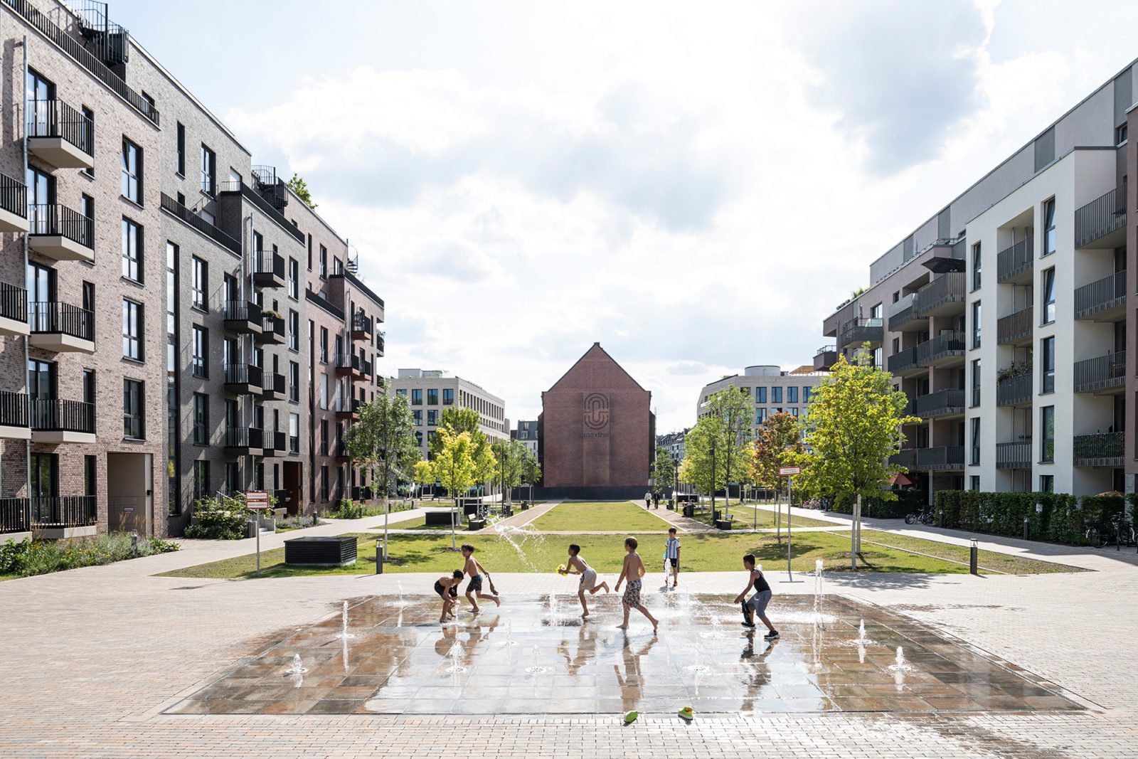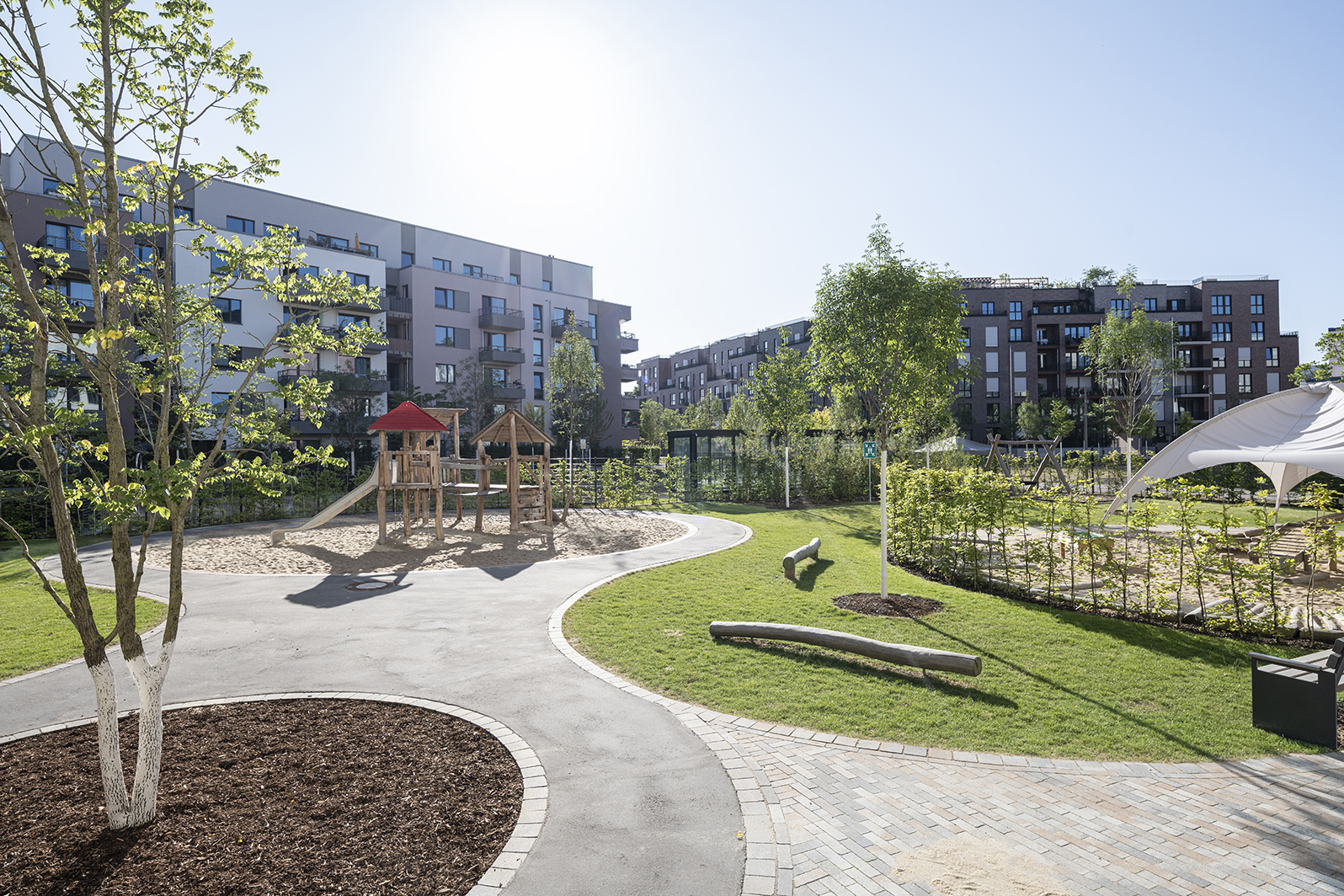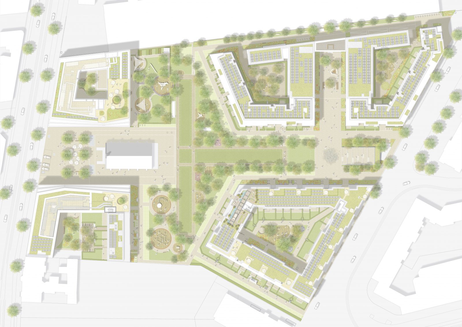 Den neuen Mittelpunkt bildet eine „grüne Mitte“, in der Spielplatz, Wasserfontänen, Kita, offene Aufenthaltsräume und durchgehende Wegeverbindungen ineinandergreifen. Breite Baumgruppen mit über 120 Laubbäumen strukturieren das Gelände, spenden Schatten und stärken die Biodiversität.