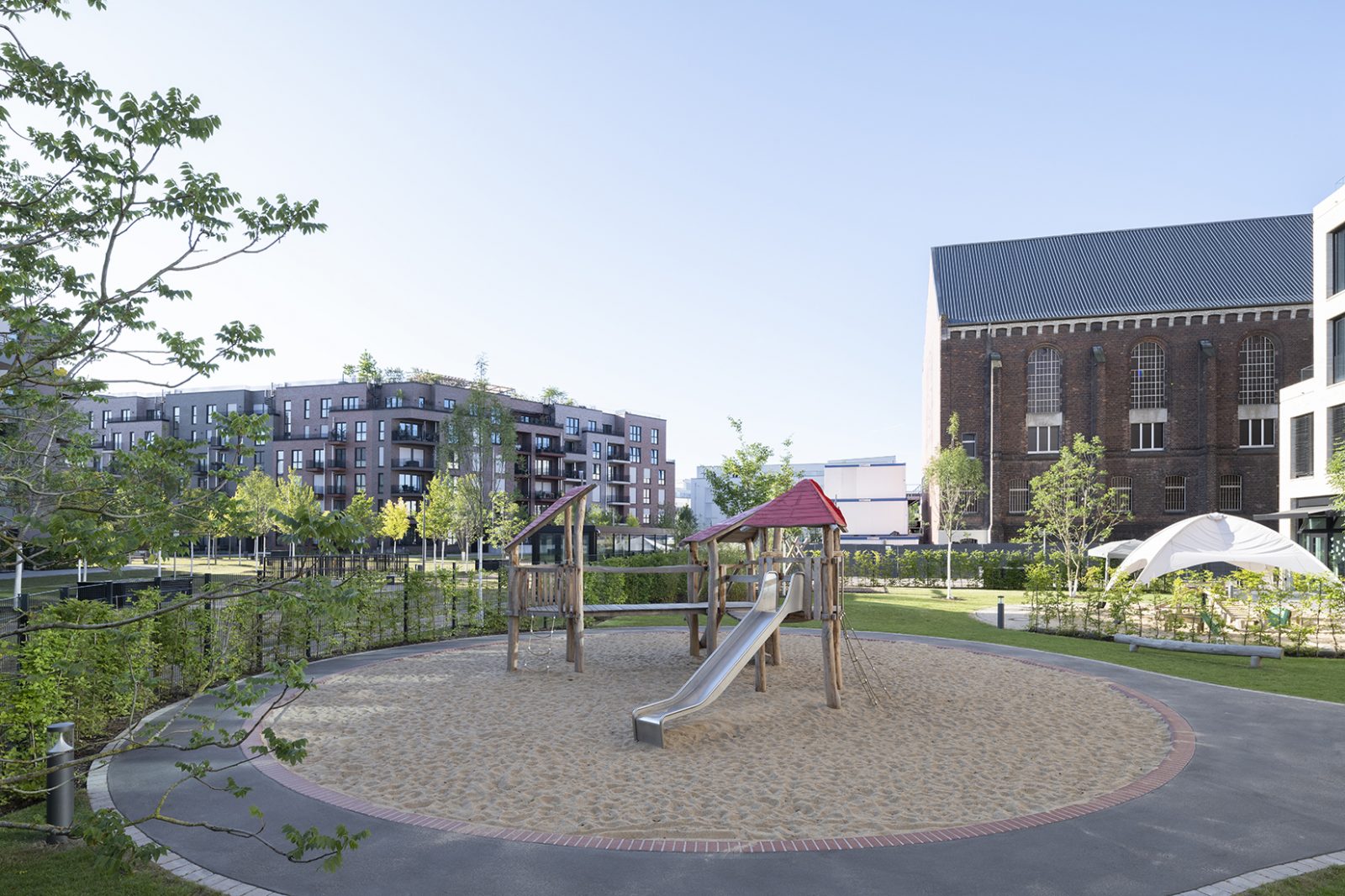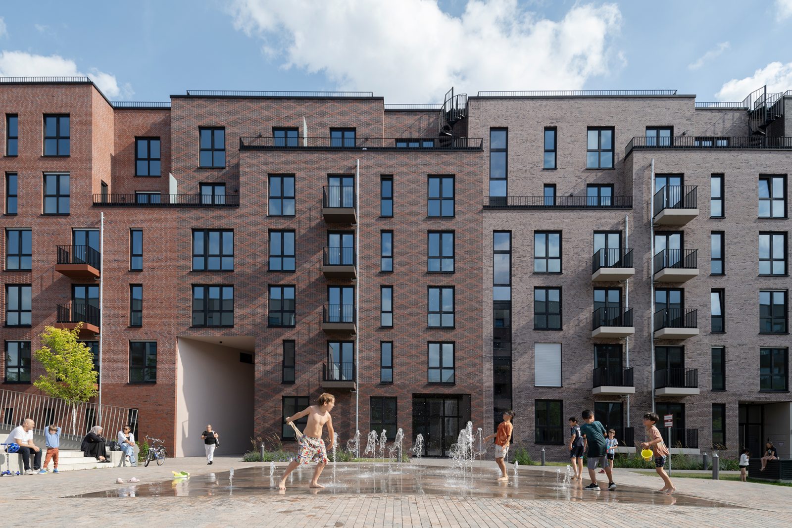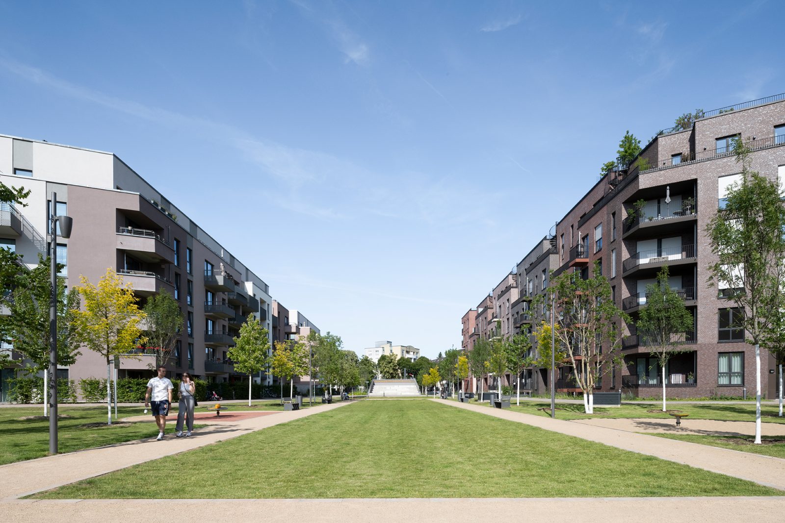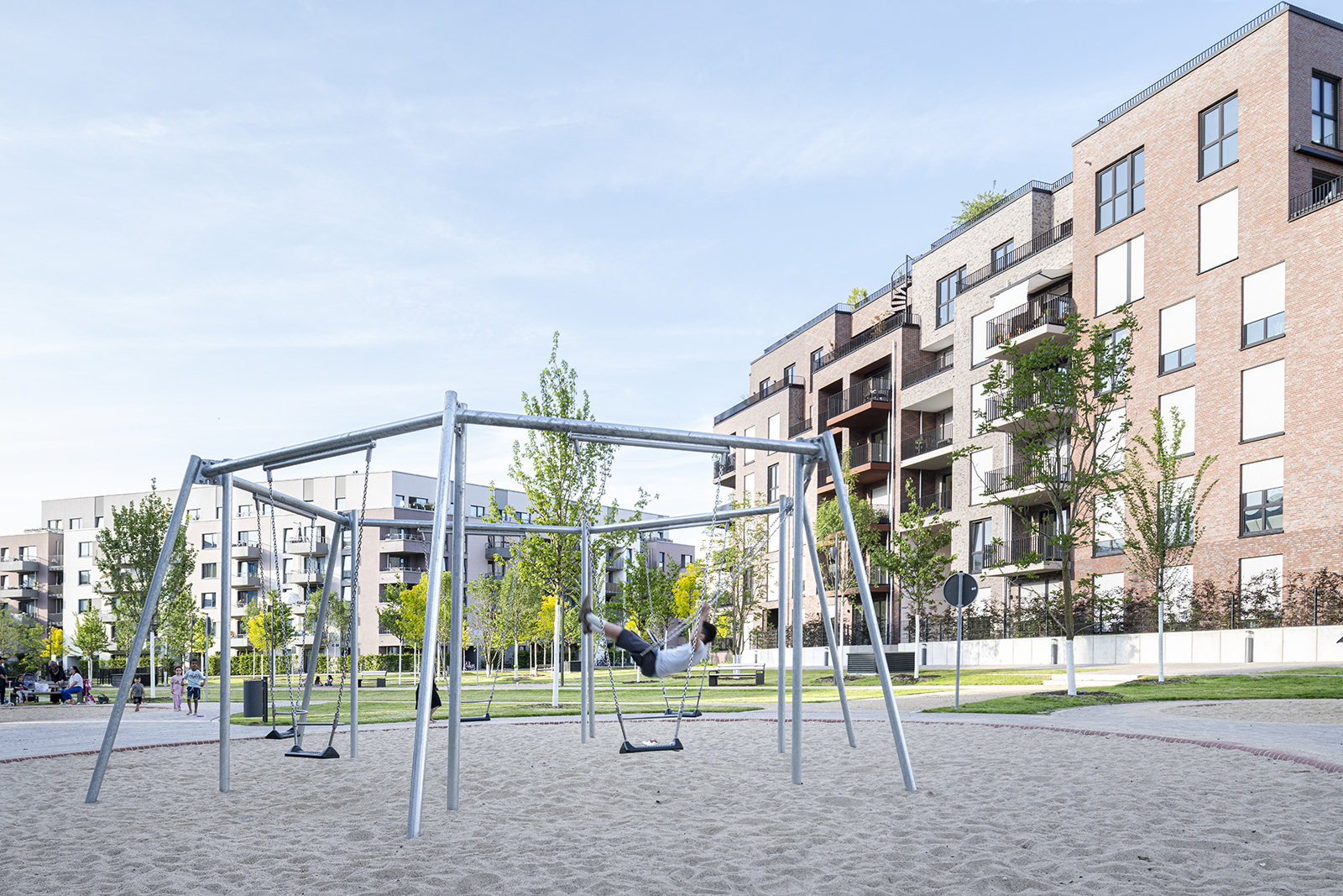 Den neuen Mittelpunkt bildet eine „grüne Mitte“, in der Spielplatz, Wasserfontänen, Kita, offene Aufenthaltsräume und durchgehende Wegeverbindungen ineinandergreifen. Breite Baumgruppen mit über 120 Laubbäumen strukturieren das Gelände, spenden Schatten und stärken die Biodiversität.