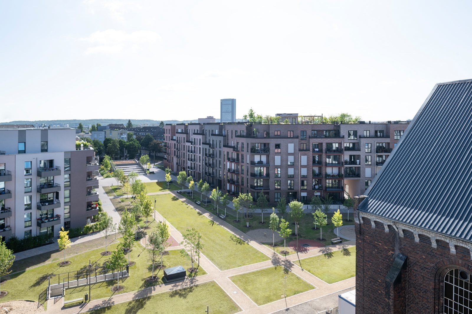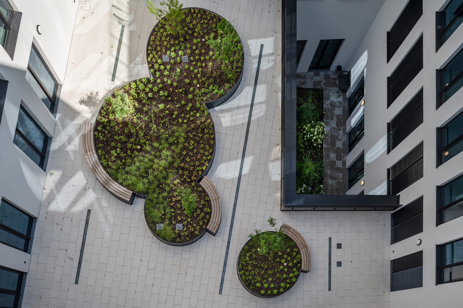 Die extensive Dachbegrünung fungiert als „fünfte Fassade“. Sie verbessert das Mikroklima, hält Regenwasser zurück und schafft Rückzugsräume auf Dachgärten und Terrassen. Auf einem der Dächer lädt zudem eine Urban-Gardening-Fläche zur gemeinschaftlichen Nutzung ein – ein Ort für nachbarschaftliches Gärtnern, Lernen und Begegnen. Der hohe Entsiegelungsgrad und die Kombination aus Regenmanagement und Photovoltaikmodulen tragen zu einer klimastabilen, emissionsarmen Stadtstruktur bei – jährlich werden rund 160 t CO₂ eingespart.
