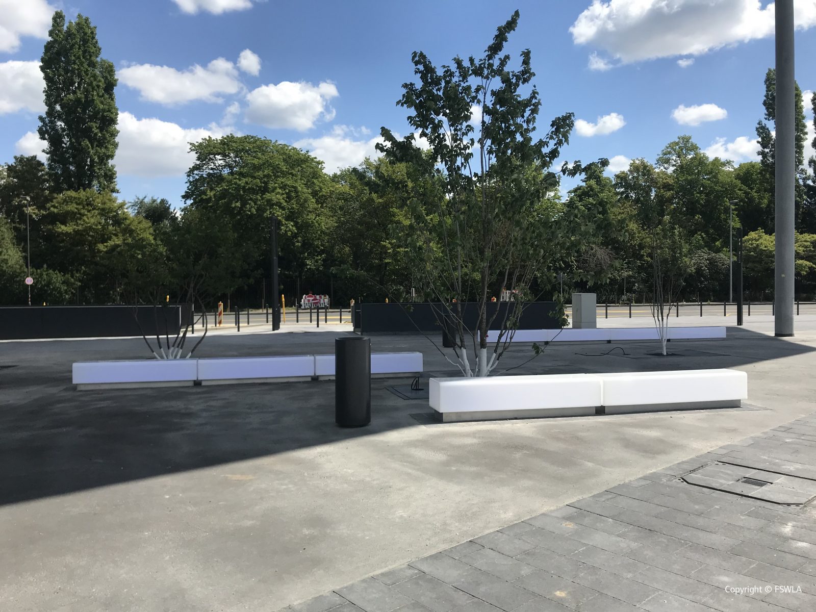 In den Aufenthaltsbereichen und entlang der Hauptwege bieten leuchtende Sitzbänke die Möglichkeit zum Ausruhen und Verweilen. Locker angeordnete Bäume sorgen für Beschattung und Orientierung.