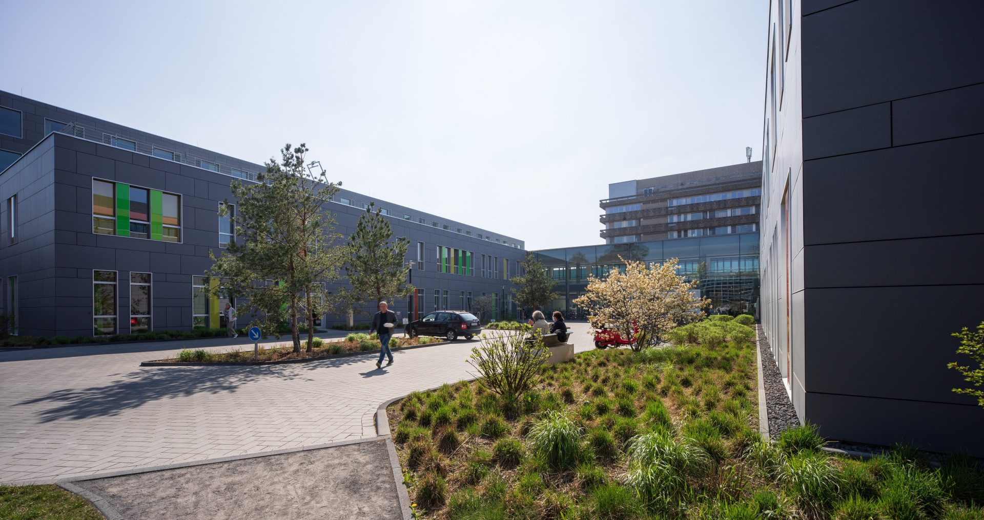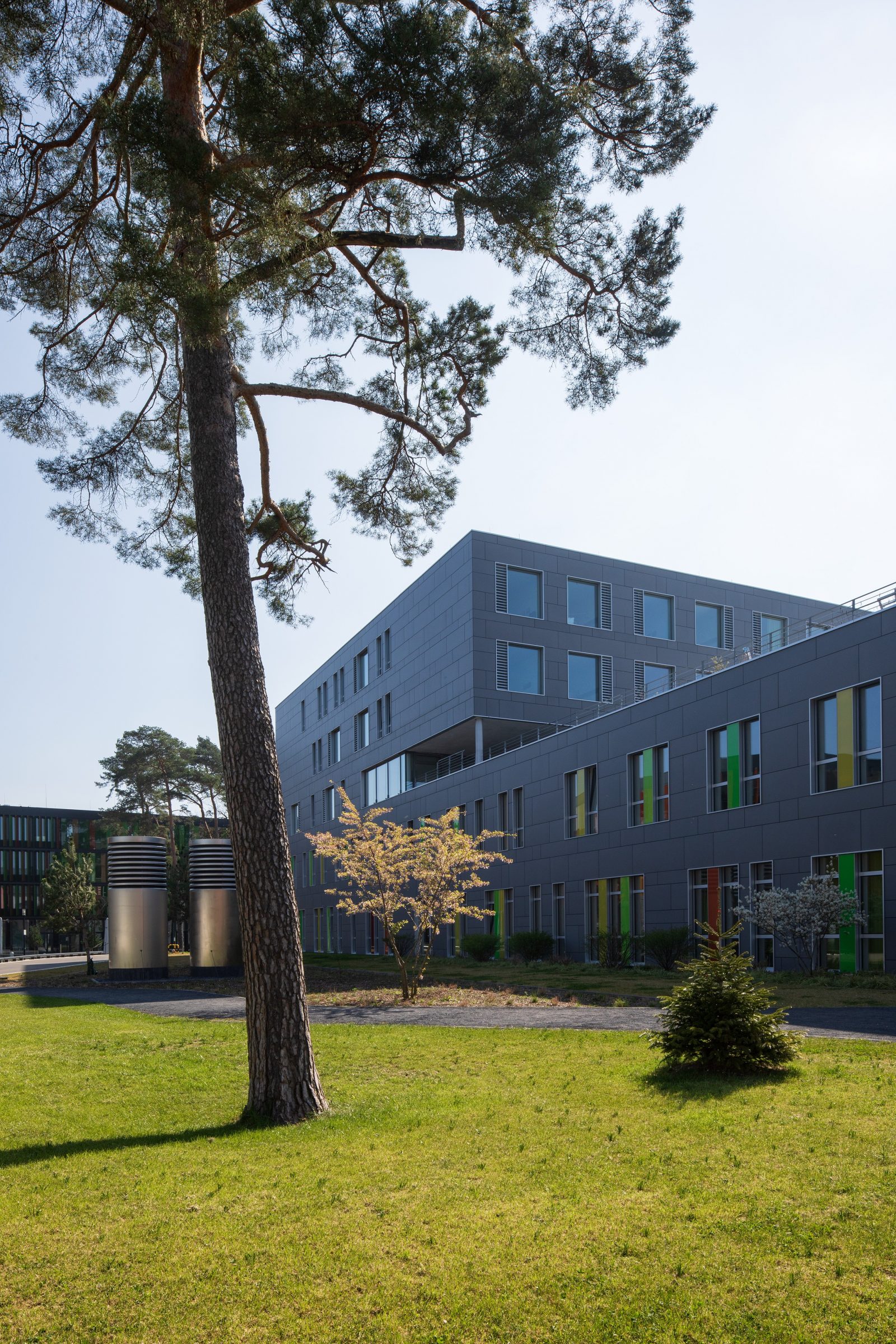 Der Charakter der „Zwischenräume“ soll durch Neuanpflanzungen unterstützt, belebt und regeneriert werden. Eichen und Kiefern führen deshalb bis an die Fassaden heran. Innen und Aussen ergänzen sich aus der Nähe in die Ferne betrachtet zu erlebbaren Raumkontinium. Skulpturale, sanfte Erdmodellierungen bepflanzt mit Gräserlandschaften verstärken die Intensität und sensibilisieren die Wahrnehmung.Musik untermalt die Symbolik.