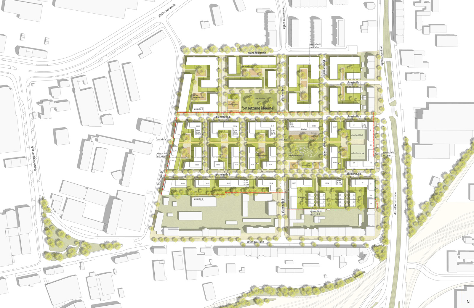 Im Norden entlang der Planstraße A sind 7 Fahrradanlehnbügel für insgesamt 14 Stellplätze vorgesehen. Für einen grünen Charakter erhält der Fahrradabstellplatz einen Belag durch Hydropor-Rasenplatten.