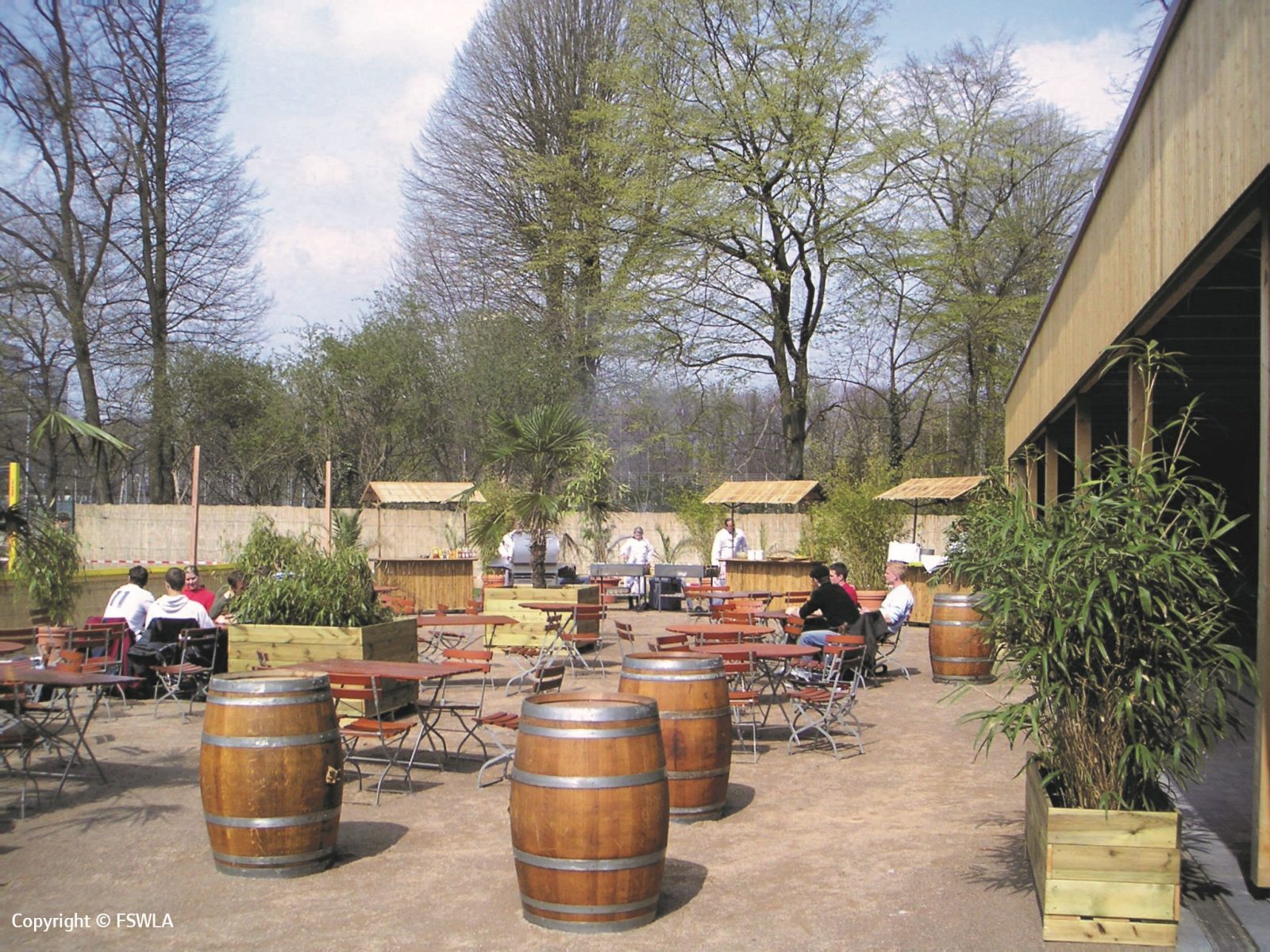 Die Aussenanlagen sind geprägt durch das Sandspielfeld und Wegeverbindungen zwischen den Bauteilen. Dem Bauteil C ist eine Fläche aus ungebundener Decke vorgelagert, die als Biergarten genutzt wird.