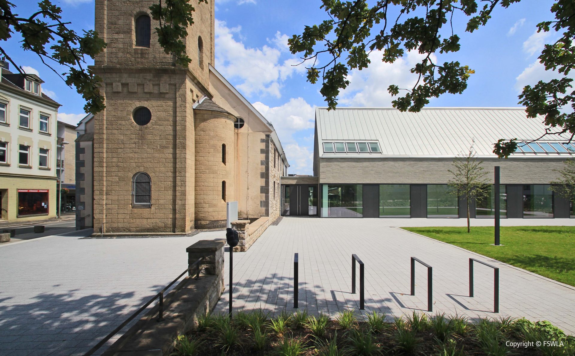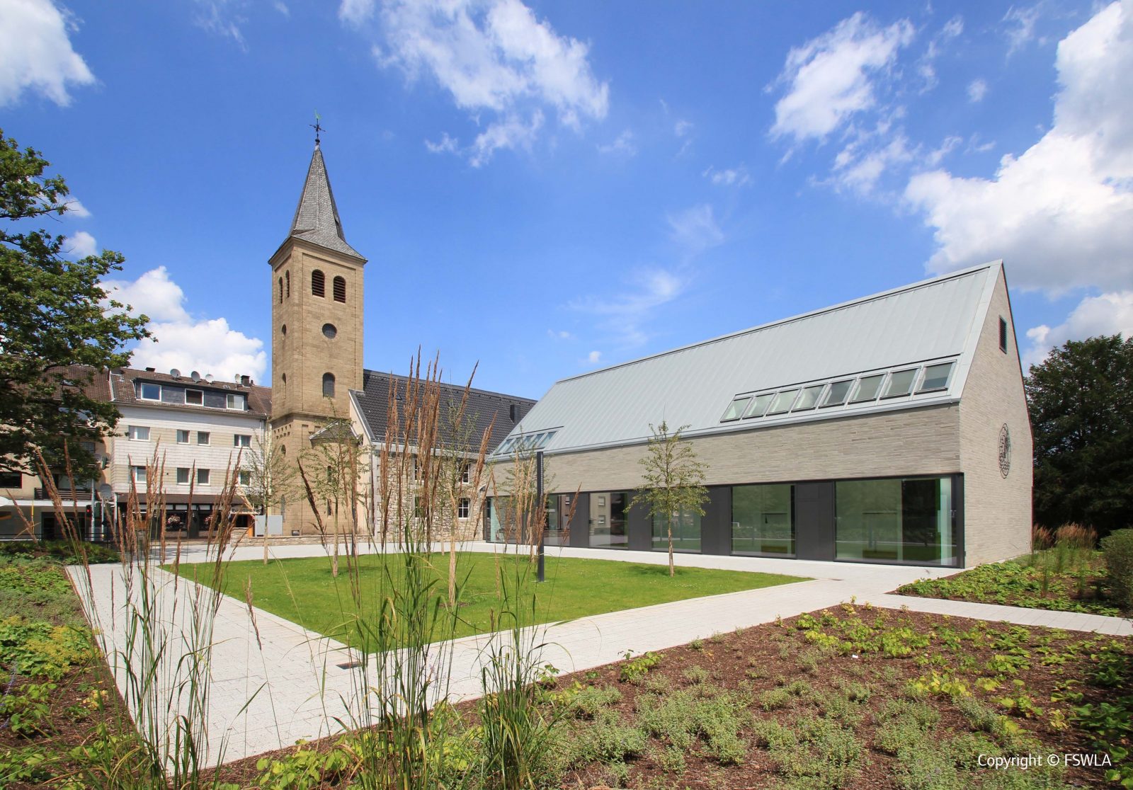 Der Kirchplatz ist großzügig und offen gestaltet, so dass ein vielfältiges Miteinander für Feste und Aktivitäten der Gemeinde kultiviert werden kann. Räumlich wird der Platz in grünen Rändern durch eine Baumreihe aus Winterlinden dominiert. Die notwendigen Besucherstellplätze sind oberirdisch angeordnet und erschließen auf kurzem, barrierefreiem Weg das Gemeindezentrum. Natursteinmauern definieren den Kirchhof als Platzfläche. Sitzstufen schaffen Aufenthaltsqualität.