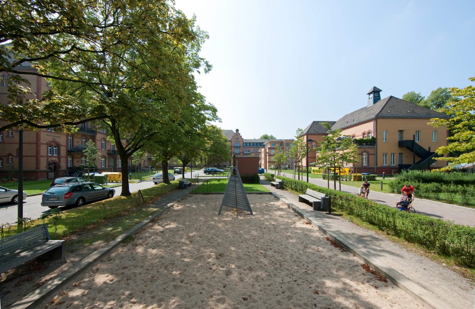 An den Gebäuden werden jeweils privat genutzte, erdgeschossbezogene Gärten erschlossen, die neben einer Zugangstreppe eine Holzterrasse erhalten. In den gemeinschaftlich nutzbaren Flächen werden großzügige, ruhige Rasenflächen hergestellt, die durch Baumreihen gegliedert werden. Die vorhandenen Baumreihen werden soweit möglich erhalten und durch Neupflanzungen ergänzt, so dass der einladende Eindruck des Neuen Gartens nachhaltig gesichert wird.
