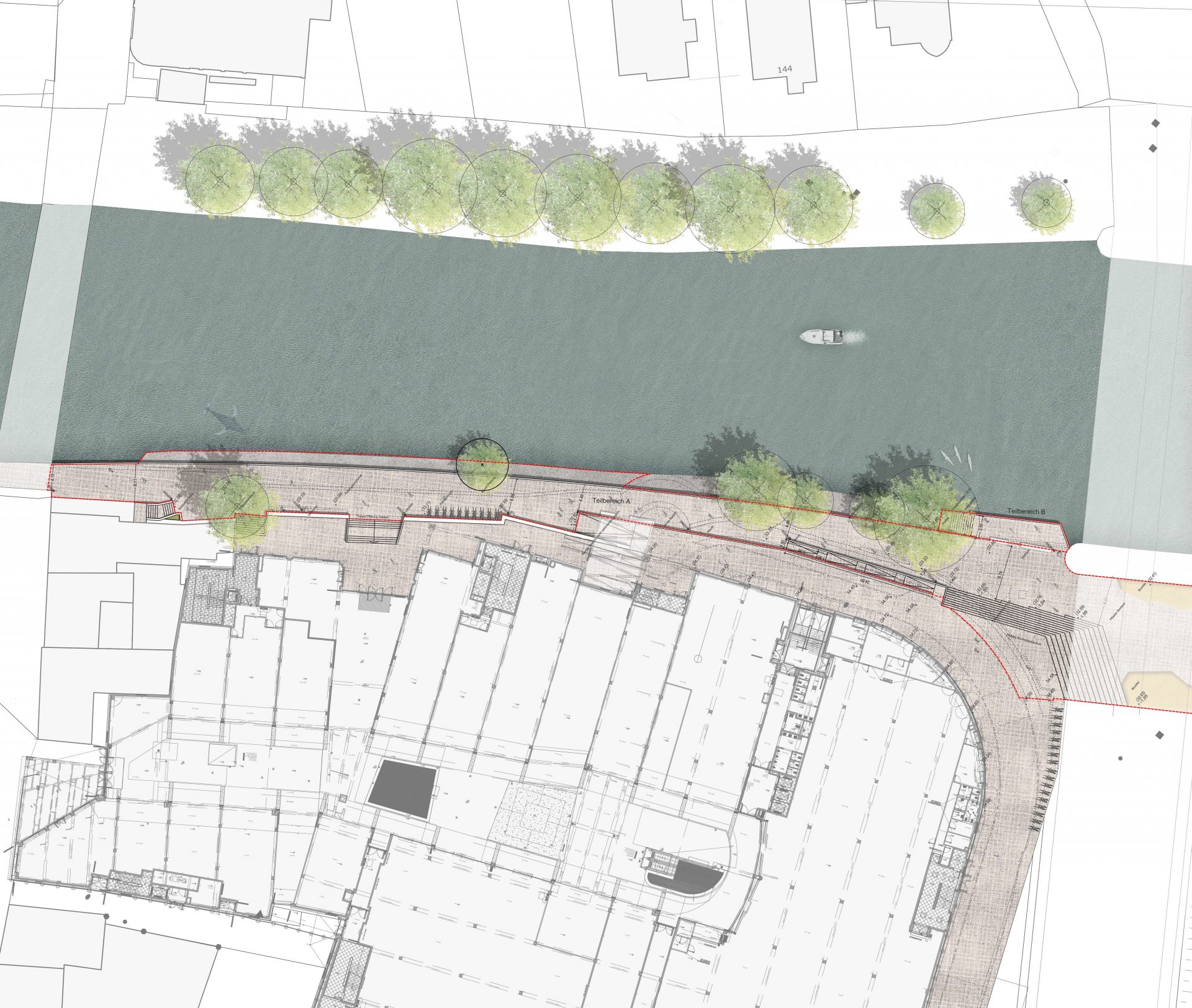 Die geplante großzügige Treppenanlage aus Betonstufen, die sich im Bereich unter der Brücke aufweitet, schafft eine attraktive Verbindung der oberen Ebene mit der Promenade. Ein behindertengerechter Zugang erfolgt zukünftig über eine Rampe, die sich in Verlängerung der Treppenanlage an einem zentralen Bereich dieses Uferabschnittes befindet.