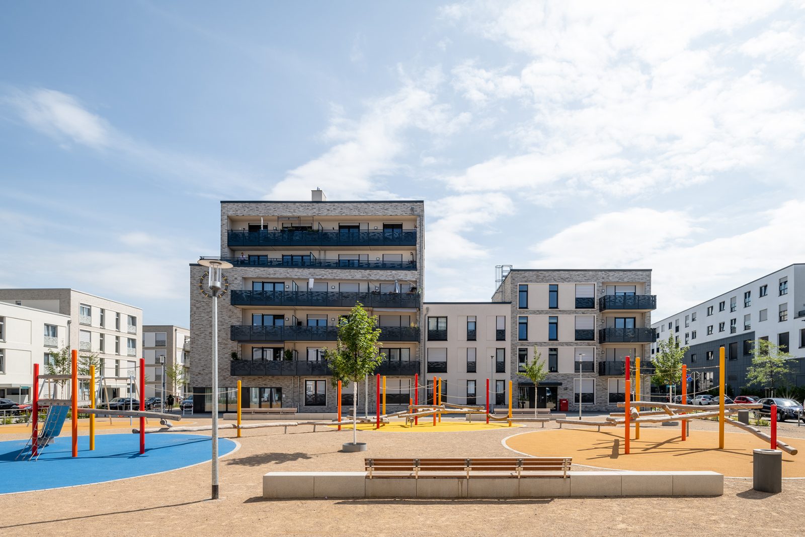 Das Gestaltungskonzept verfolgt das Ziel, ein Wohnumfeld mit hoher Aufenthaltsqualität für alle Bewohner*innen zu schaffen. Dazu gehören ausreichende öffentliche und private Spielflächen, öffentliche und gemeinschaftlich nutzbare Treffpunkte sowie privat genutzte Gärten an den Erdgeschosswohnungen.