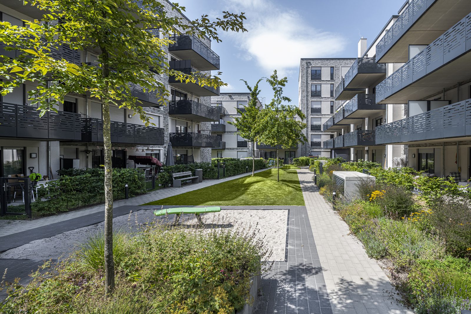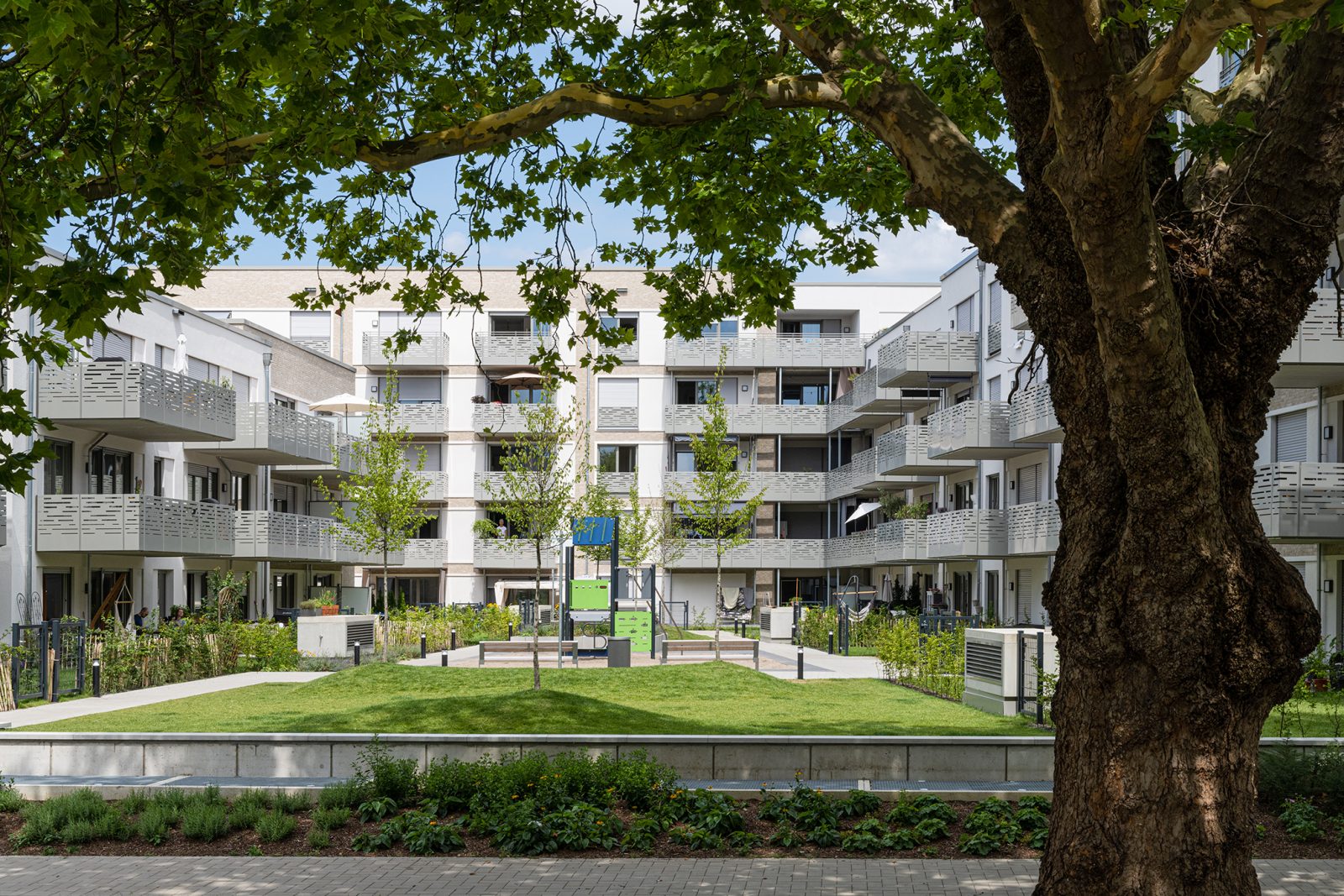 Die Freiflächen der fünf Baufelder sind der privaten und gemeinschaftlichen Nutzung vorbehalten. Die Innenhöfe werden mit Baum- und Strauchpflanzungen, Rasen- und Staudenflächen abwechslungsreich gestaltet und bieten damit eine hohe Aufenthaltsqualität.