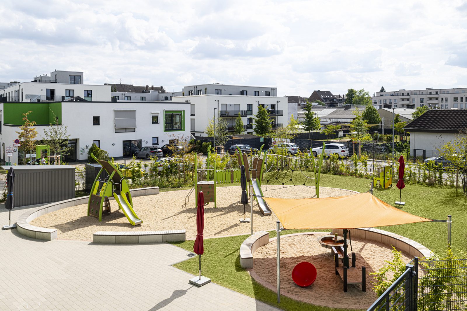 Das südliche Wohnquartier wird über eine verkehrsberuhigte Querung mit dem nördlichen Plangebiet mit einer öffentlichen Grünfläche (Grünanlage mit Spielplatz) verbunden. Hier ist ein Kinderspielplatz geplant. Seine Ausstattung wird auf die Spielangebote des südlich angrenzenden Quartiersplatzes abgestimmt und soll diese ergänzen. Eine vielseitig nutzbare Fläche aus ungebundener Wegedecke wird mit Spielpunkten aus synthetischen Fallschutzbelägen und einer großzügigen Kletteranlage rhythmisiert. Sitzbänke mit Rückenlehne laden unter den großen blühenden Tulpenbäumen und Blaseneschen zu Verweilen ein.
