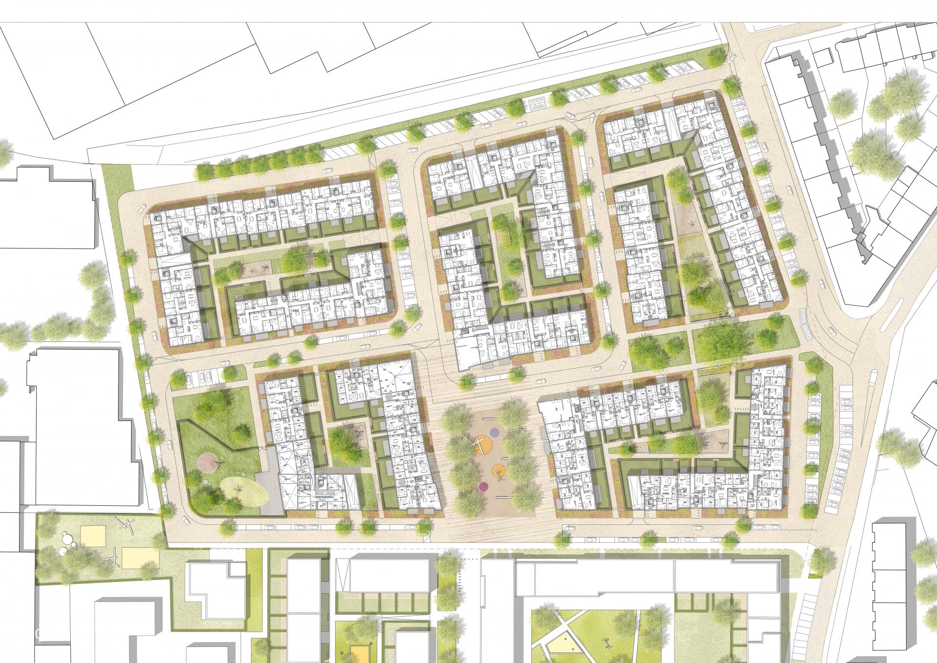Das Gestaltungskonzept verfolgt das Ziel, ein Wohnumfeld mit hoher Aufenthaltsqualität für alle Bewohner*innen zu schaffen. Dazu gehören ausreichende öffentliche und private Spielflächen, öffentliche und gemeinschaftlich nutzbare Treffpunkte sowie privat genutzte Gärten an den Erdgeschosswohnungen.