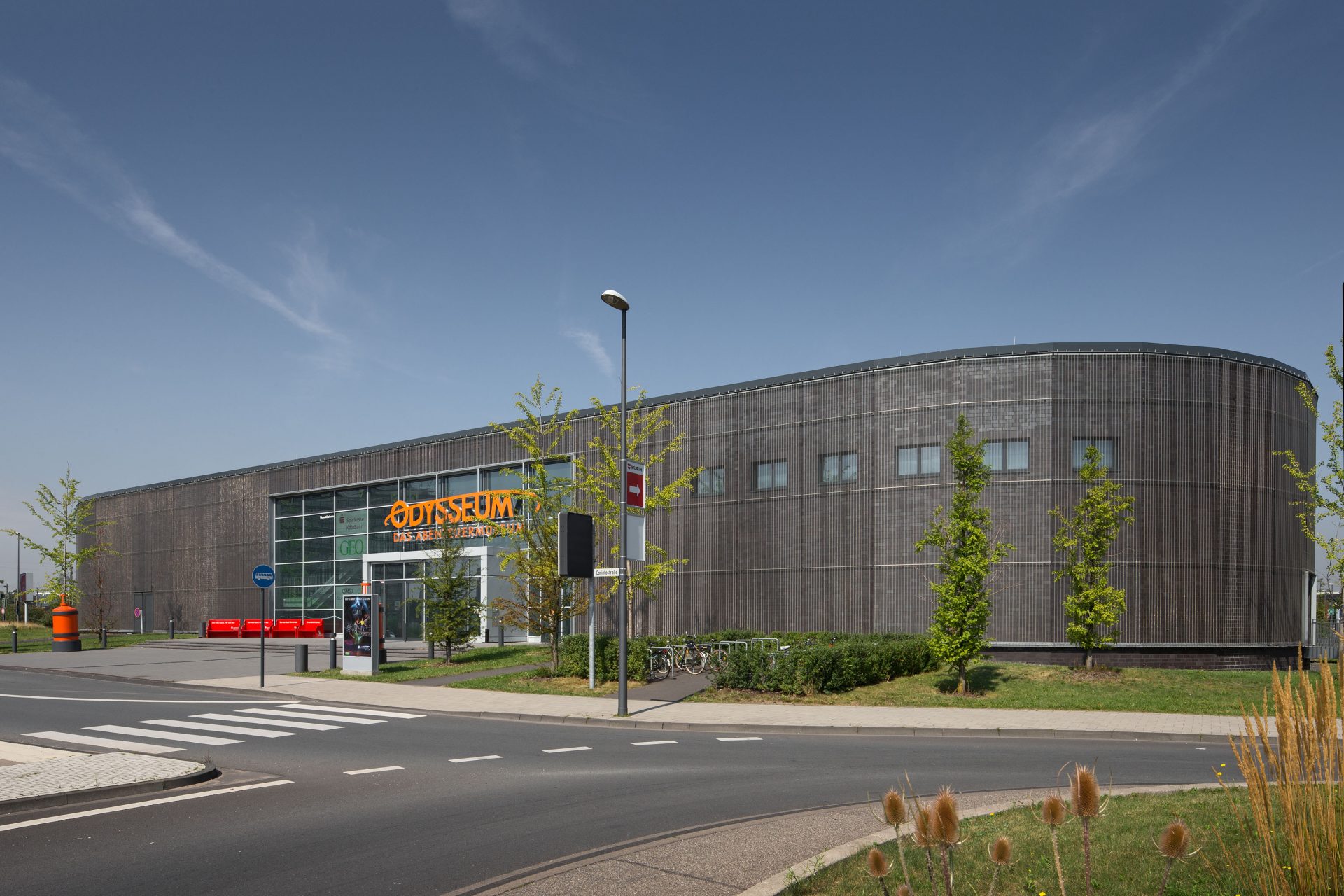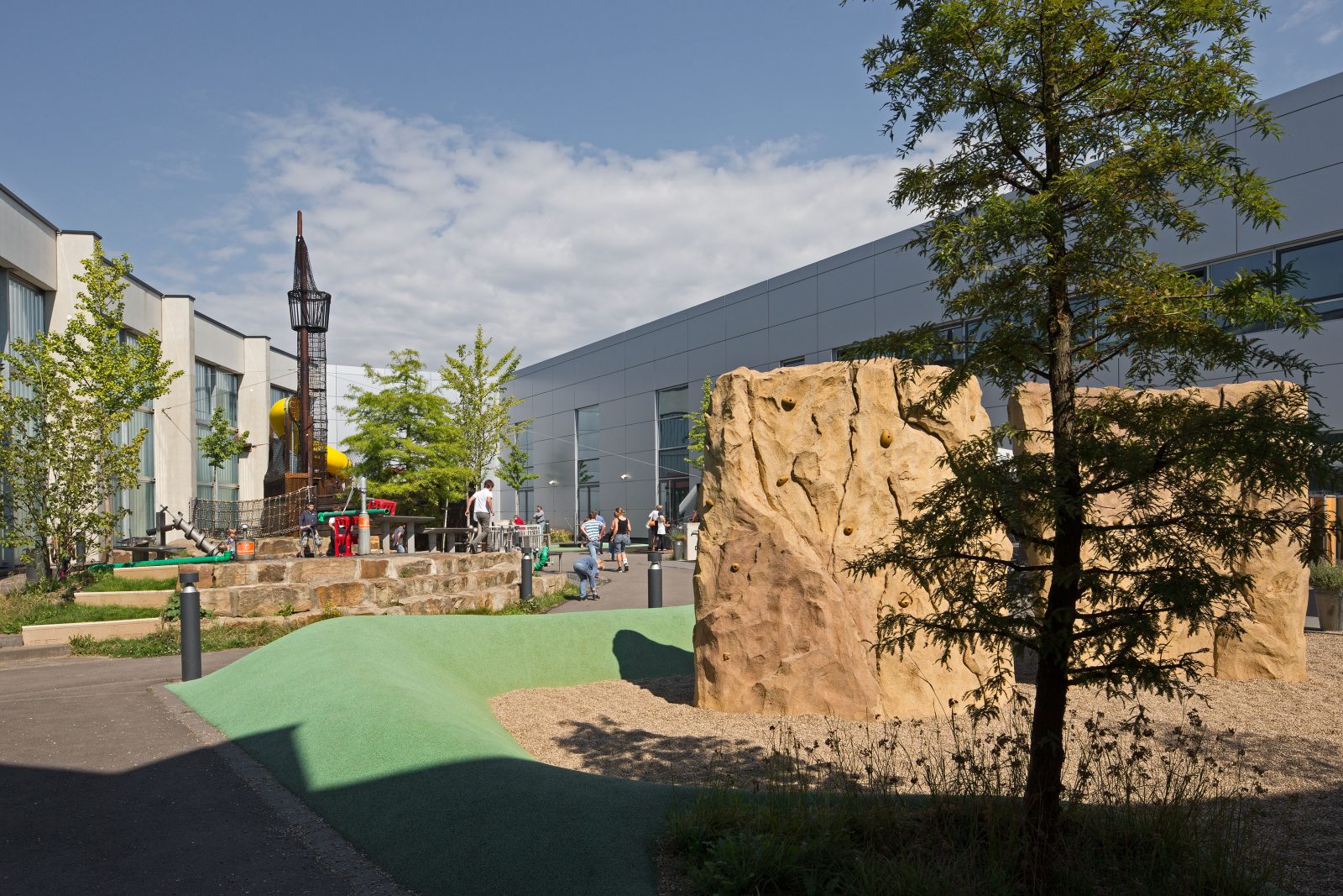Der Haupeingang wird durch seine, wie ein Teppich aus dem Gebäude herausgeführte Befestigung, und die großzügige Freitreppe besonders betont. Die Formensprache ist hier wie beim Gebäude reduziert. Rampen für Behinderte und Fahrradstellplätze werden in die weichen Formen leicht und unauffällig integriert.