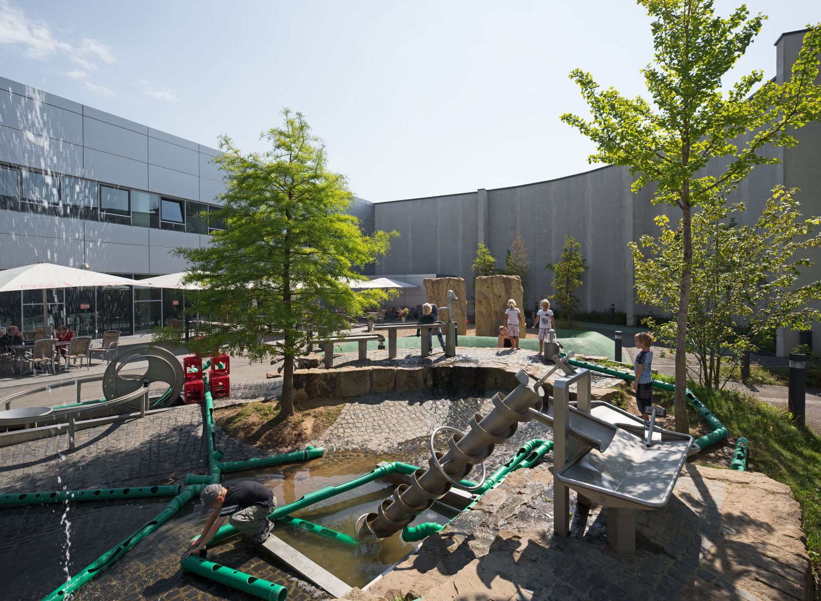 Der Außenerlebnisbereich ist zum Erleben und Benutzen da. Durch die Abschirmung des Straßenlärms durch die Glasfassade und durch das höher gelegene Niveau entsteht ein besonderer Raum. Die Grundstruktur