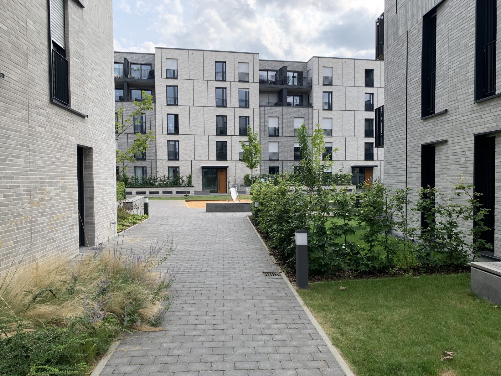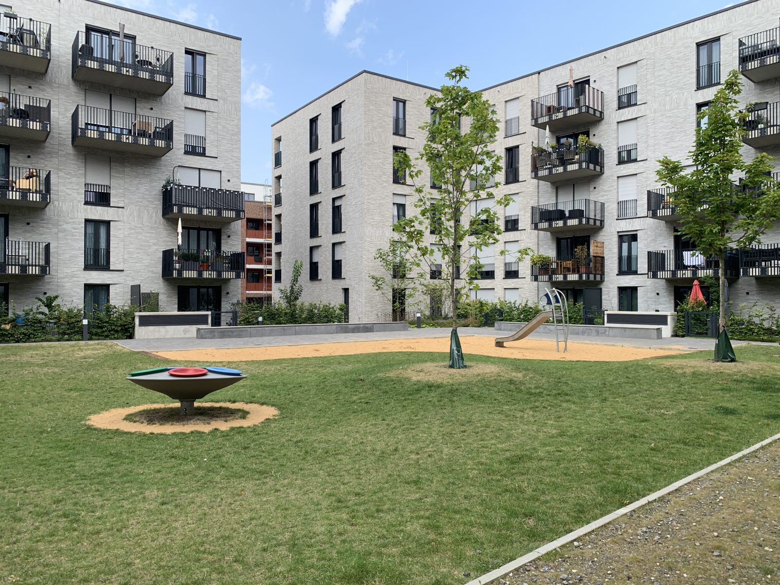 Intensiv begrünte und offen gestaltete Außenanlagen schaffen hohe Aufenthaltsqualitäten im neuen Quartier. Das Projekt umfasst zudem eine Kindertagesstätte, einen öffentlichen Grünzug und einen Spielplatz.