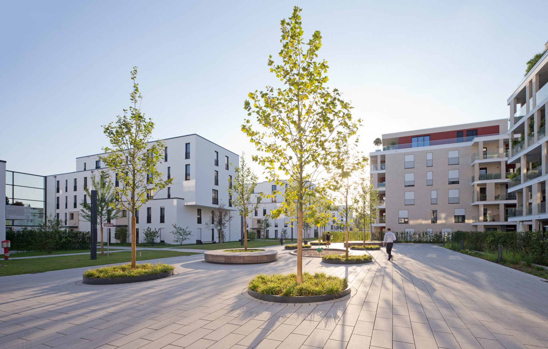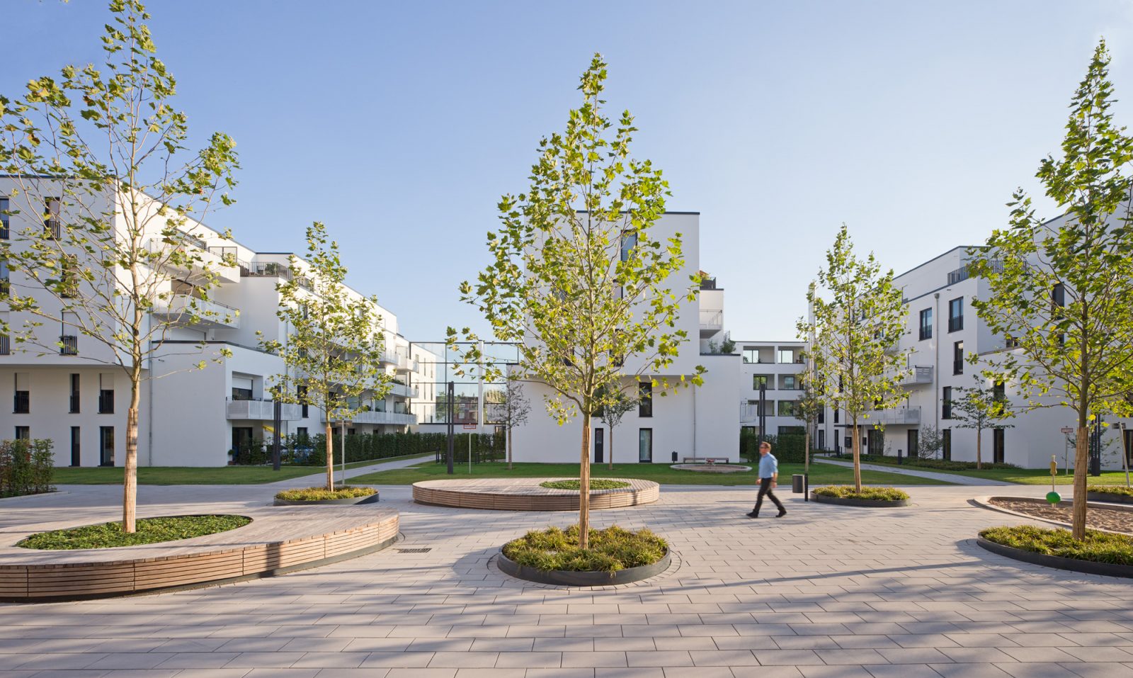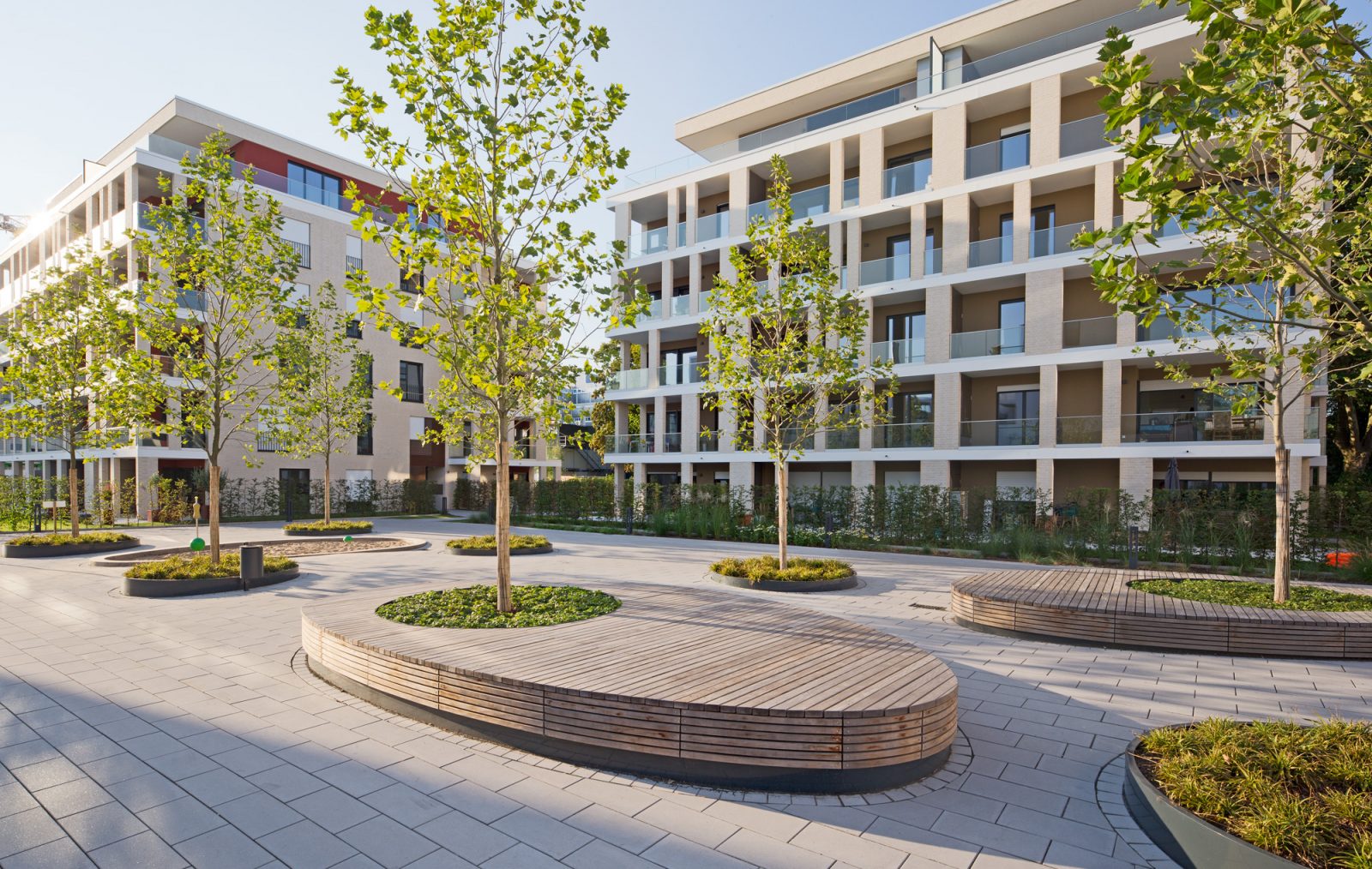 Ellipsenförmige Holzpodeste laden neben den Kleinkinderspielflächen zum Verweilen ein. Jeweils zwei Platanenreihen begrünen die Quartiersplätze, die zum Treffpunkt der umliegenden Wohnebebauung werden.