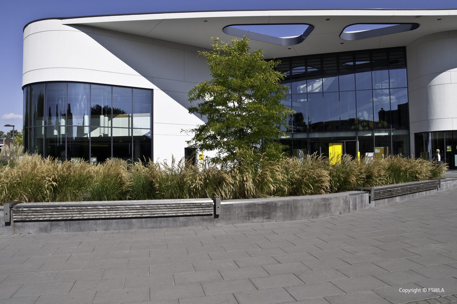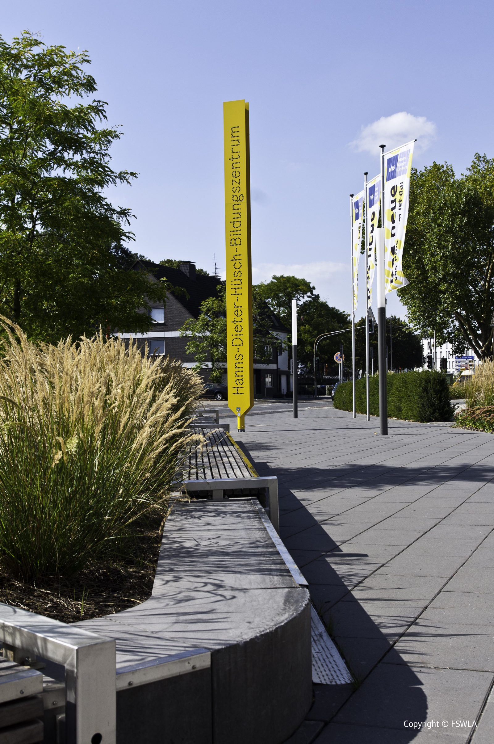 Das neue Bildungszentrum der Stadt Moers erhält einen neuen Standort. Ein Baukörper als Solitär in einer zurückhaltenden Freianlagengestaltung entfaltet seine Wirkung. Mit einer großen freundlich einladenden Geste welche sich im Vorplatz fortsetzt, öffnet sich die Gebäudefront zur Straße hin. Ein Sitzelement das sich formal dem Gebäude anpasst und eine akzentuierte Beleuchtung erzeugen Aufenthaltsqualität an dieser Stelle. Grünflächen umgeben das Gebäude wie ein „Grüne Klammer“ und bilden den Übergang zu den Erschließungsflächen. Die Stellplätze sind durch ein Hecke gegen Einsicht von der Straße abgeschirmt. Ein Baumraster spendet hier Schatten und gliedert die Fläche in angenehmer Form. Das Regenwasser welches sich auf der Dachfläche des Gebäudes sammelt, wird in einer Rigole unter dem Parkplatz versickert.