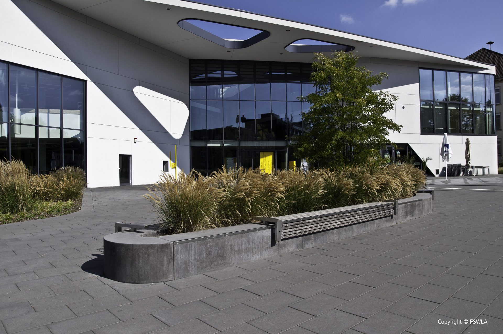 Das neue Bildungszentrum der Stadt Moers erhält einen neuen Standort. Ein Baukörper als Solitär in einer zurückhaltenden Freianlagengestaltung entfaltet seine Wirkung. Mit einer großen freundlich einladenden Geste welche sich im Vorplatz fortsetzt, öffnet sich die Gebäudefront zur Straße hin. Ein Sitzelement das sich formal dem Gebäude anpasst und eine akzentuierte Beleuchtung erzeugen Aufenthaltsqualität an dieser Stelle. Grünflächen umgeben das Gebäude wie ein „Grüne Klammer“ und bilden den Übergang zu den Erschließungsflächen. Die Stellplätze sind durch ein Hecke gegen Einsicht von der Straße abgeschirmt. Ein Baumraster spendet hier Schatten und gliedert die Fläche in angenehmer Form. Das Regenwasser welches sich auf der Dachfläche des Gebäudes sammelt, wird in einer Rigole unter dem Parkplatz versickert.