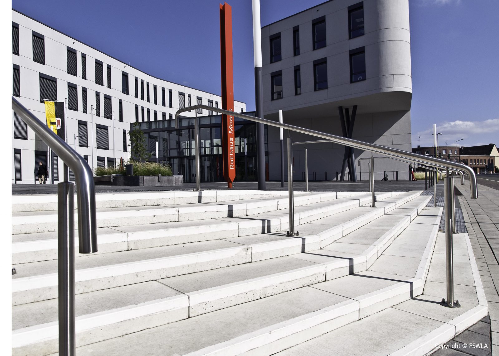 Schlichte zurückhaltende Eleganz und respektvoller Umgang mit der historischen Substanz, so charakterisiert sich die Freianlagenplanung im Bereich des Rathauses. Einfache Formen, gestalterisch ansprechend und funktional überzeugend, bilden das Bindeglied zwischen Neubau, historischem Rathaus und historischer Wallanlage.