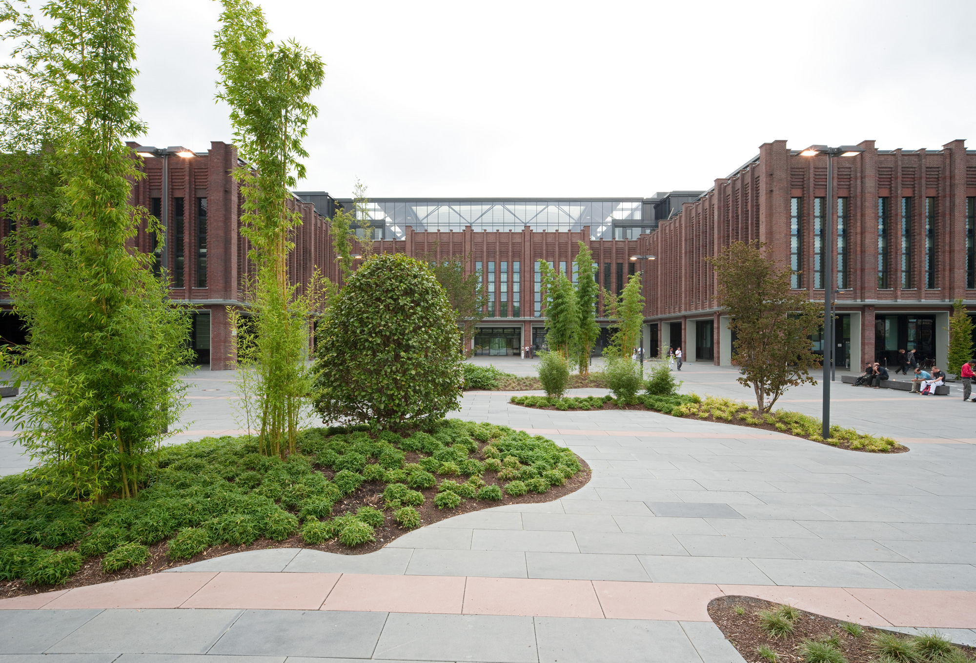 Die Freianlagen des großen, zusammenhängenden Gebäudekomplexes lassen Mitarbeiter:innen und Besucher:innen abtauchen in eine interessante, eigenständige Bildwelt. Sie besteht aus zwei großen Themenbereichen: einer Magistrale und 14 unterschiedlichen Innenhöfen. Mit unserer Planungsidee entwickelten wir hier zum einen eine unverwechselbare Identität, zum anderen erfüllten wir funktionale Ansprüche.