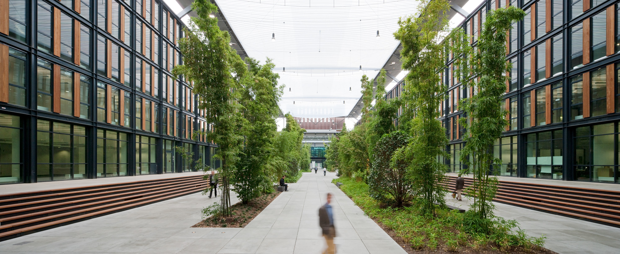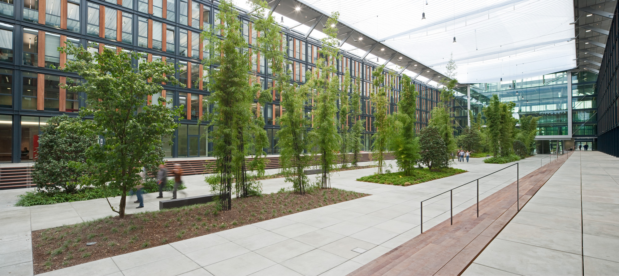 Die Magistrale verbindet die beiden Bürokomplexe miteinander und sorgt dafür, dass Drinnen und Draußen zu einer Einheit werden. Flankierende Stufen überwinden elegant den Höhenunterschied. Sitzbereiche bieten in der Mittelzone Platz zur Kommunikation und dienen der Erholung. Die Strukturierung der Oberfläche mit Bändern zitiert die umgebende architektonische Formensprache.