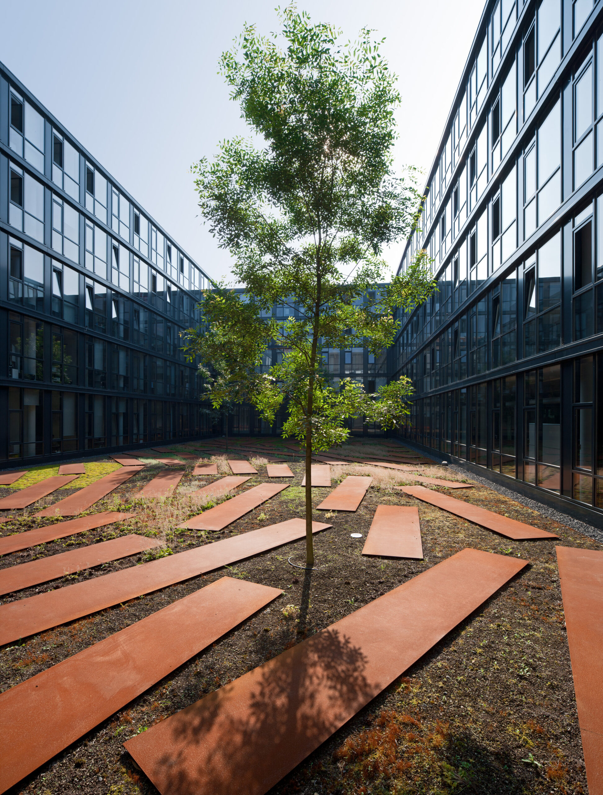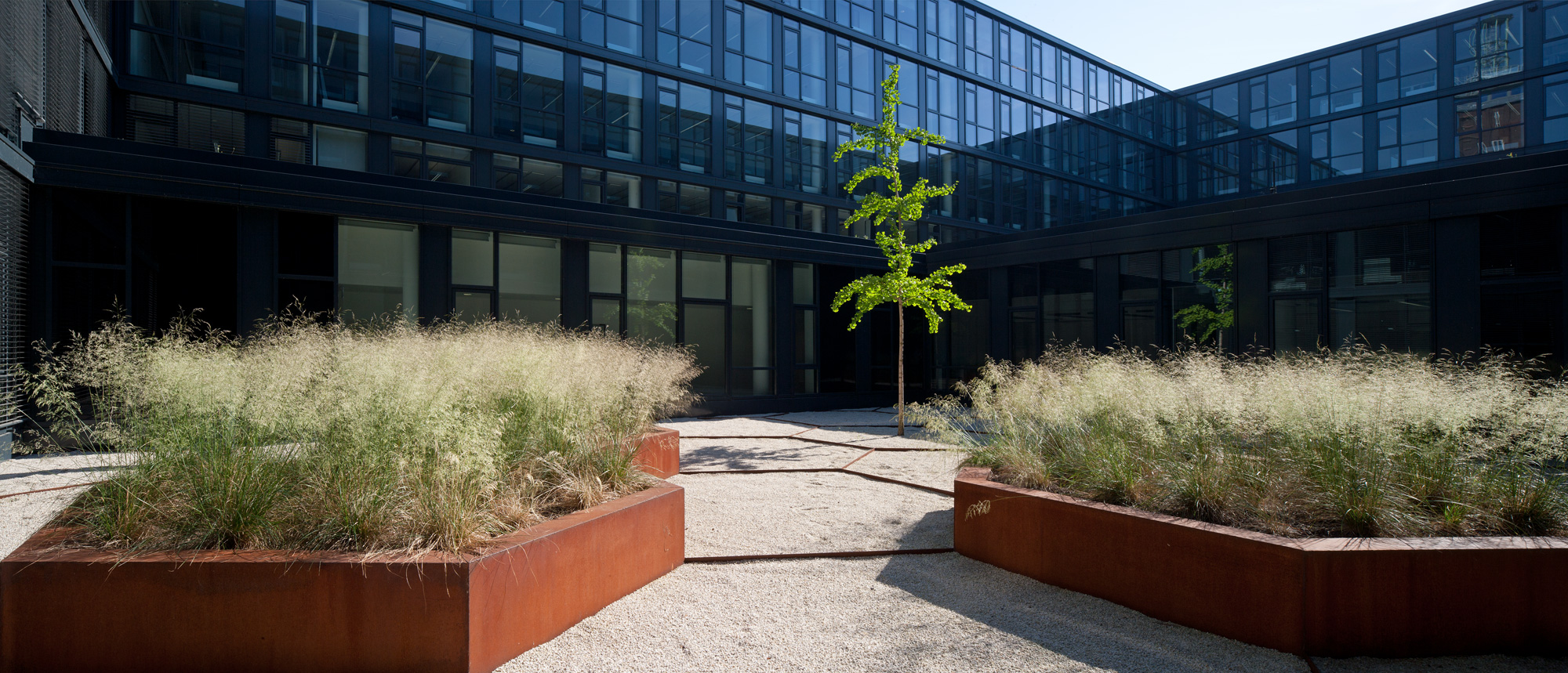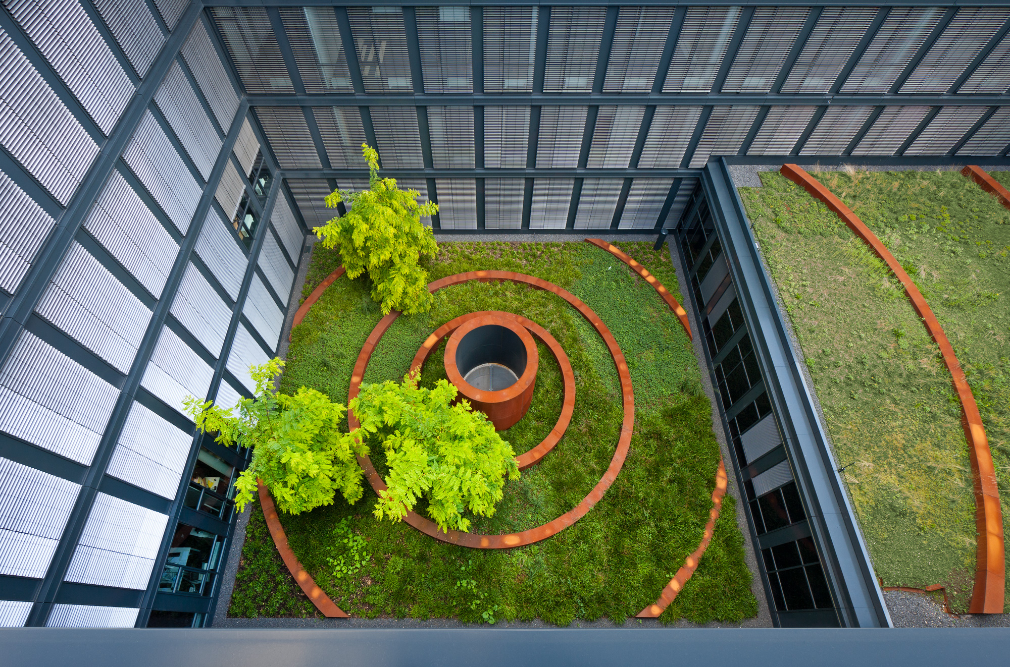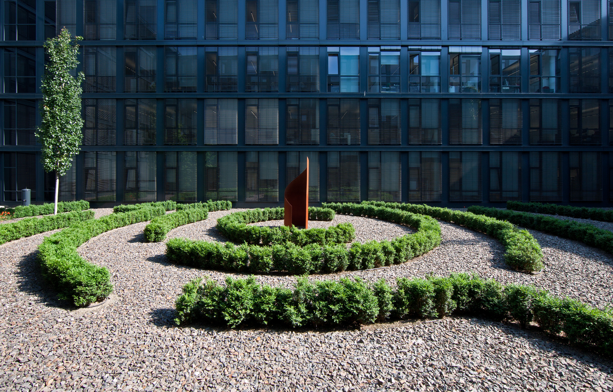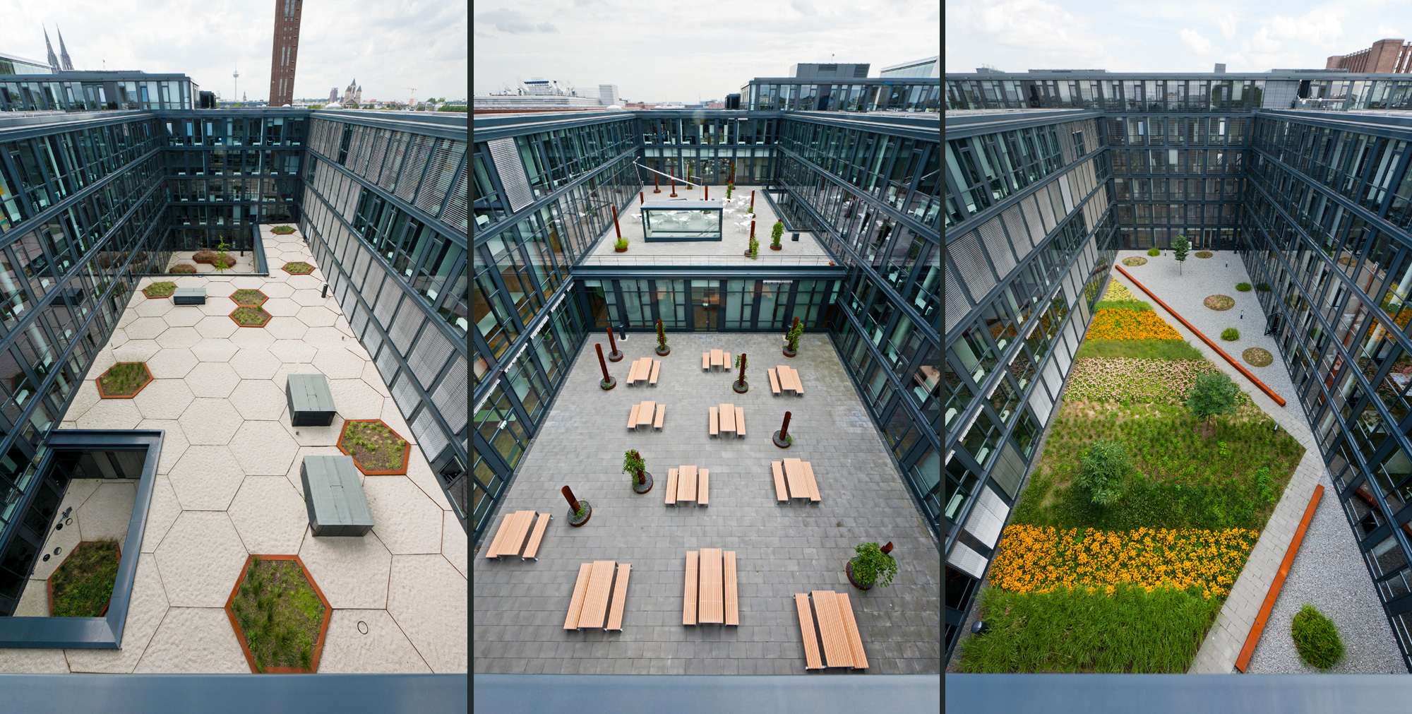 Aufgrund der Vielzahl der Büros kann nur ein Teil der Mitarbeitenden den Rheinblick genießen. Die abwechslungsreich gestalteten, kontemplativen Innenhöfe bieten hier eine attraktive Alternative: Das Raumangebot mit Büros zu den Höfen hin wird hervorragend angenommen. Jeder Innenhof definiert einen bestimmten Abschnitt des Gebäudes. Ein Blick aus einem Fenster genügt und man weiß aufgrund der Hofgestaltung, wo im Gebäude man sich gerade befindet.