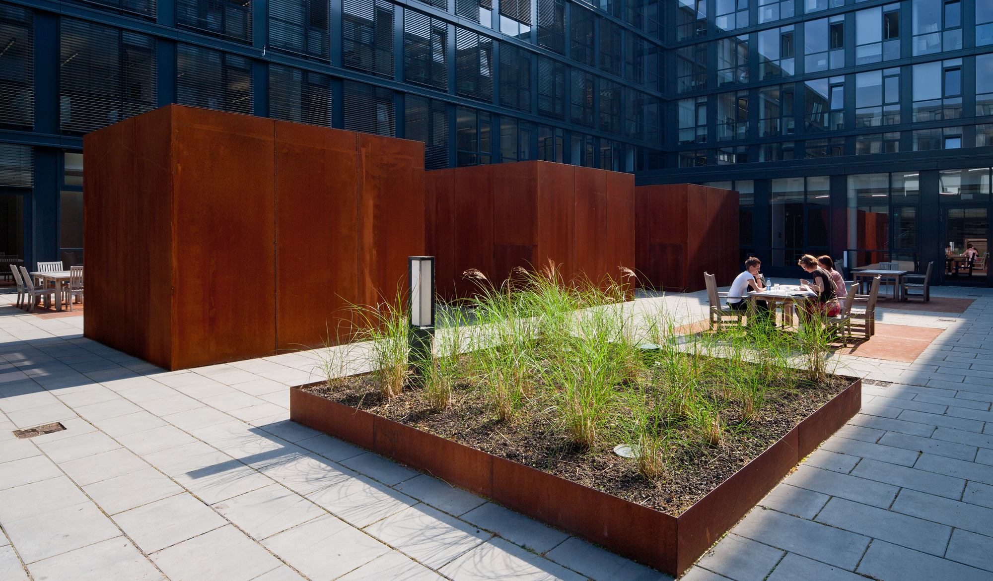 Beim Betrachten und Betreten der Hofwelt entstehen immer wieder neue Eindrücke. Es sind 14 bunte, fröhliche Bilderwelten, deren Rahmen die Architektur ist. Bepflanzung, Stein- und Stahlauswahl sind in allen Höfen gleich, werden jedoch unterschiedlich verwendet. Im Rhythmus der Jahreszeiten vermittelt der Freiraum stets eine erholsame Ruhe inmitten des hektischen Berufsalltags.