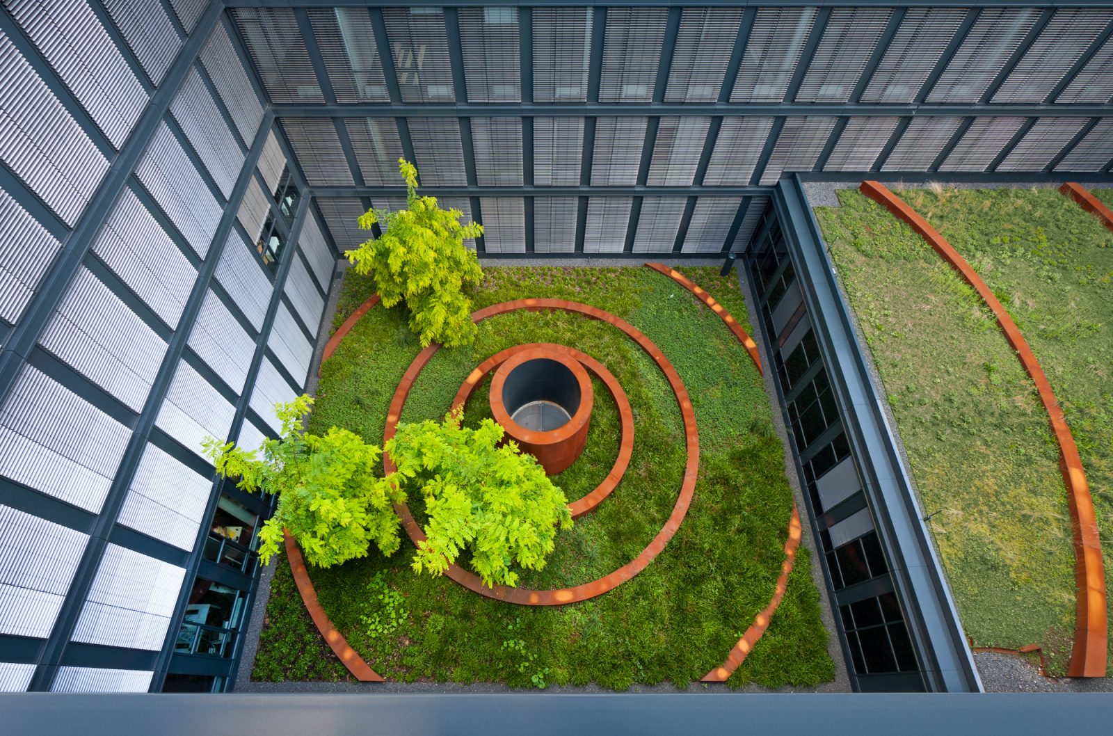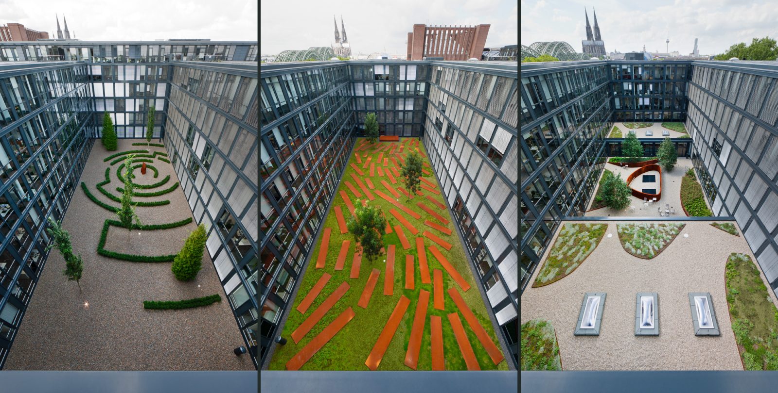Eine denkmalgeschützte Fassade direkt am Rhein. Dahinter ist eine neue Bürowelt entstanden für RTL und die Versicherungsgruppe Talanx. Die Freianlagen des großen, zusammenhängenden Gebäudekomplexes lassen Mitarbeiter und Besucher abtauchen in eine interessante, eigenständige Bildwelt. Sie besteht aus zwei großen Themenbereichen: einer Magistrale und 14 unterschiedlichen Innenhöfen. Mit unserer Planungsidee entwickelten wir hier zum einen eine unverwechselbare Identität, zum anderen erfüllten wir funktionale Ansprüche. Aufgrund der Vielzahl der Büros kann nur ein Teil der Mitarbeiter den Rheinblick genießen. Die abwechslungsreich gestalteten, kontemplativen Innenhöfe bieten hier eine attraktive Alternative: Das Raumangebot mit Büros zu den Höfen hin wird hervorragend angenommen. Jeder Innenhof definiert einen bestimmten Abschnitt des Gebäudes. Ein Blick aus einem Fenster genügt und man weiß aufgrund der Hofgestaltung, wo im Gebäude man sich gerade befindet. Beim Betrachten und Betreten der Hofwelt entstehen immer wieder neue Eindrücke. Es sind 14 bunte, fröhliche Bilderwelten, deren Rahmen die Architektur ist. Bepflanzung, Stein- und Stahlauswahl sind in allen Höfen gleich, werden jedoch unterschiedlich verwendet. Im Rhythmus der Jahreszeiten vermittelt der Freiraum stets eine erholsame Ruhe inmitten des hektischen Berufsalltags. Die Magistrale verbindet die beiden Bürokomplexe miteinander und sorgt dafür, dass Drinnen und Draußen zu einer Einheit werden. Flankierende Stufen überwinden elegant den Höhenunterschied. Sitzbereiche bieten in der Mittelzone Platz zur Kommunikation und dienen der Erholung. Die Strukturierung der Oberfläche mit Bändern zitiert die umgebende architektonische Formensprache.