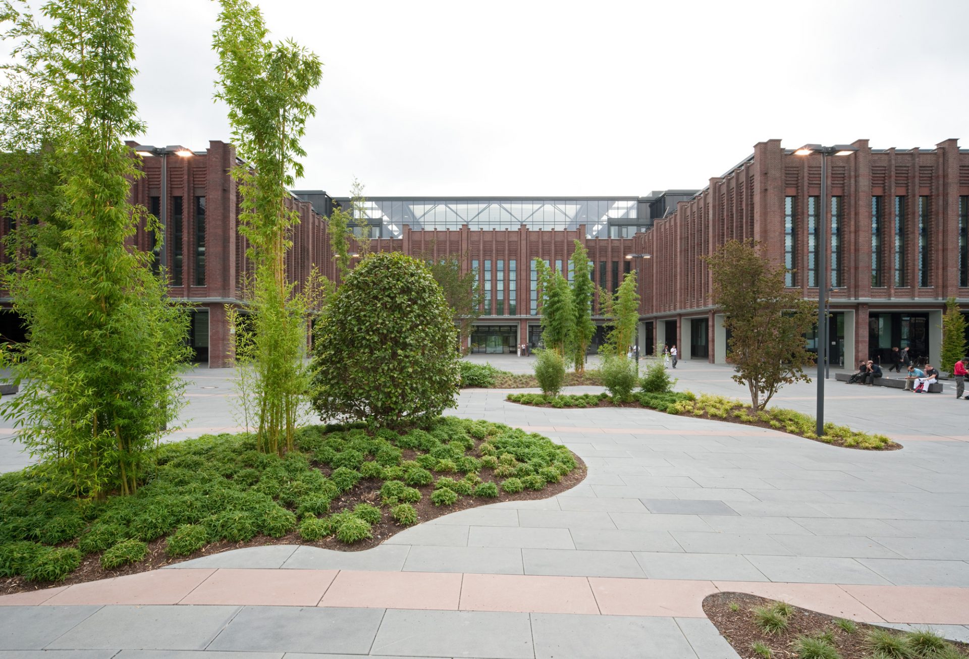Eine denkmalgeschützte Fassade direkt am Rhein. Dahinter ist eine neue Bürowelt entstanden für RTL und die Versicherungsgruppe Talanx. Die Freianlagen des großen, zusammenhängenden Gebäudekomplexes lassen Mitarbeiter und Besucher abtauchen in eine interessante, eigenständige Bildwelt. Sie besteht aus zwei großen Themenbereichen: einer Magistrale und 14 unterschiedlichen Innenhöfen. Mit unserer Planungsidee entwickelten wir hier zum einen eine unverwechselbare Identität, zum anderen erfüllten wir funktionale Ansprüche. Aufgrund der Vielzahl der Büros kann nur ein Teil der Mitarbeiter den Rheinblick genießen. Die abwechslungsreich gestalteten, kontemplativen Innenhöfe bieten hier eine attraktive Alternative: Das Raumangebot mit Büros zu den Höfen hin wird hervorragend angenommen. Jeder Innenhof definiert einen bestimmten Abschnitt des Gebäudes. Ein Blick aus einem Fenster genügt und man weiß aufgrund der Hofgestaltung, wo im Gebäude man sich gerade befindet. Beim Betrachten und Betreten der Hofwelt entstehen immer wieder neue Eindrücke. Es sind 14 bunte, fröhliche Bilderwelten, deren Rahmen die Architektur ist. Bepflanzung, Stein- und Stahlauswahl sind in allen Höfen gleich, werden jedoch unterschiedlich verwendet. Im Rhythmus der Jahreszeiten vermittelt der Freiraum stets eine erholsame Ruhe inmitten des hektischen Berufsalltags. Die Magistrale verbindet die beiden Bürokomplexe miteinander und sorgt dafür, dass Drinnen und Draußen zu einer Einheit werden. Flankierende Stufen überwinden elegant den Höhenunterschied. Sitzbereiche bieten in der Mittelzone Platz zur Kommunikation und dienen der Erholung. Die Strukturierung der Oberfläche mit Bändern zitiert die umgebende architektonische Formensprache.