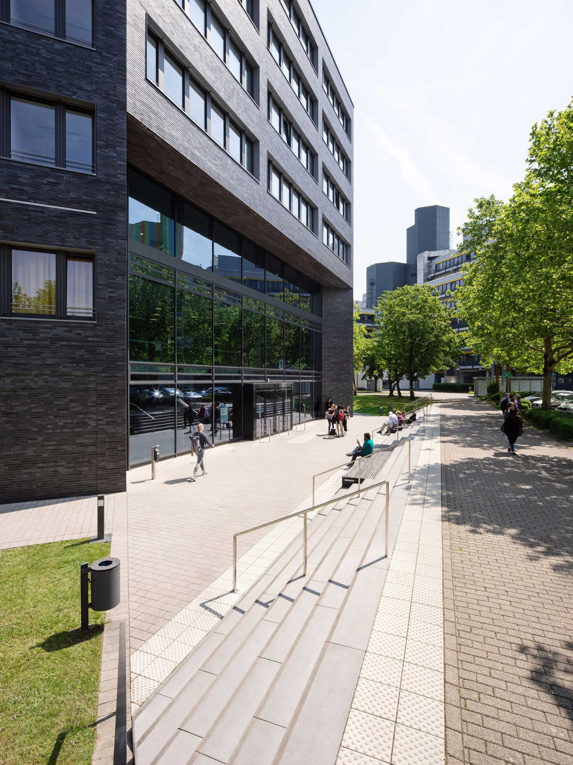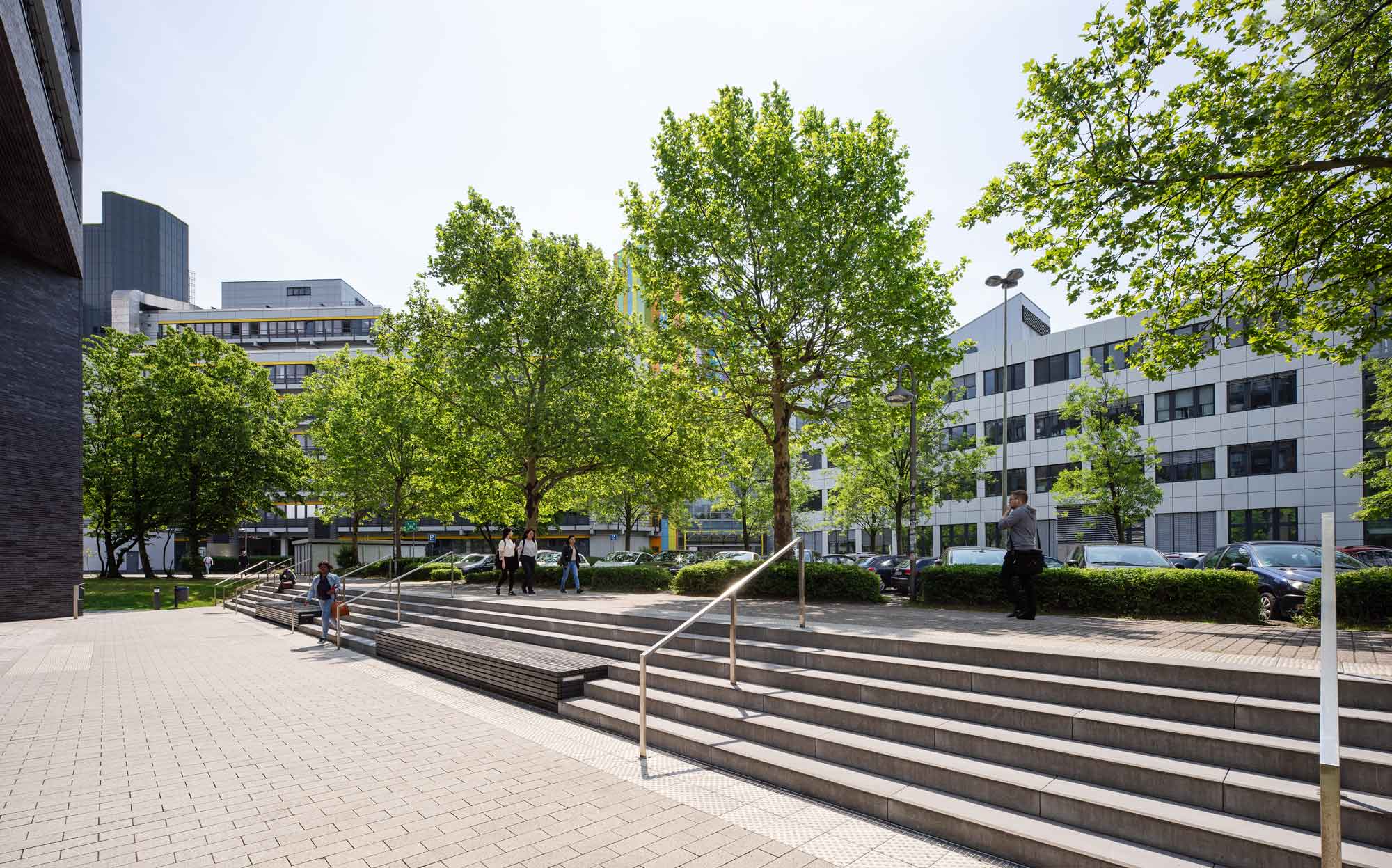 Außerhalb des Gebäudes bestand die Hauptaufgabe darin, den Gebäudesolitär in die Wege- und Parkplatzlandschaft der Uni Essen einzubinden. Über einen umlaufenden Fußweg sind alle Eingänge barrierefrei zugänglich. Höhenversprünge werden durch Treppen und Rasenböschungen angeglichen. Im Bereich des Haupteinganges weitet sich der vorhandene Fußweg zu einer kleinen Platzfläche mit einer großzügigen Treppenanlage, als einladenden Geste, auf. In die Treppe sind Sitzbänke intergriert, um die Aufenthaltsqualität zu optimieren.