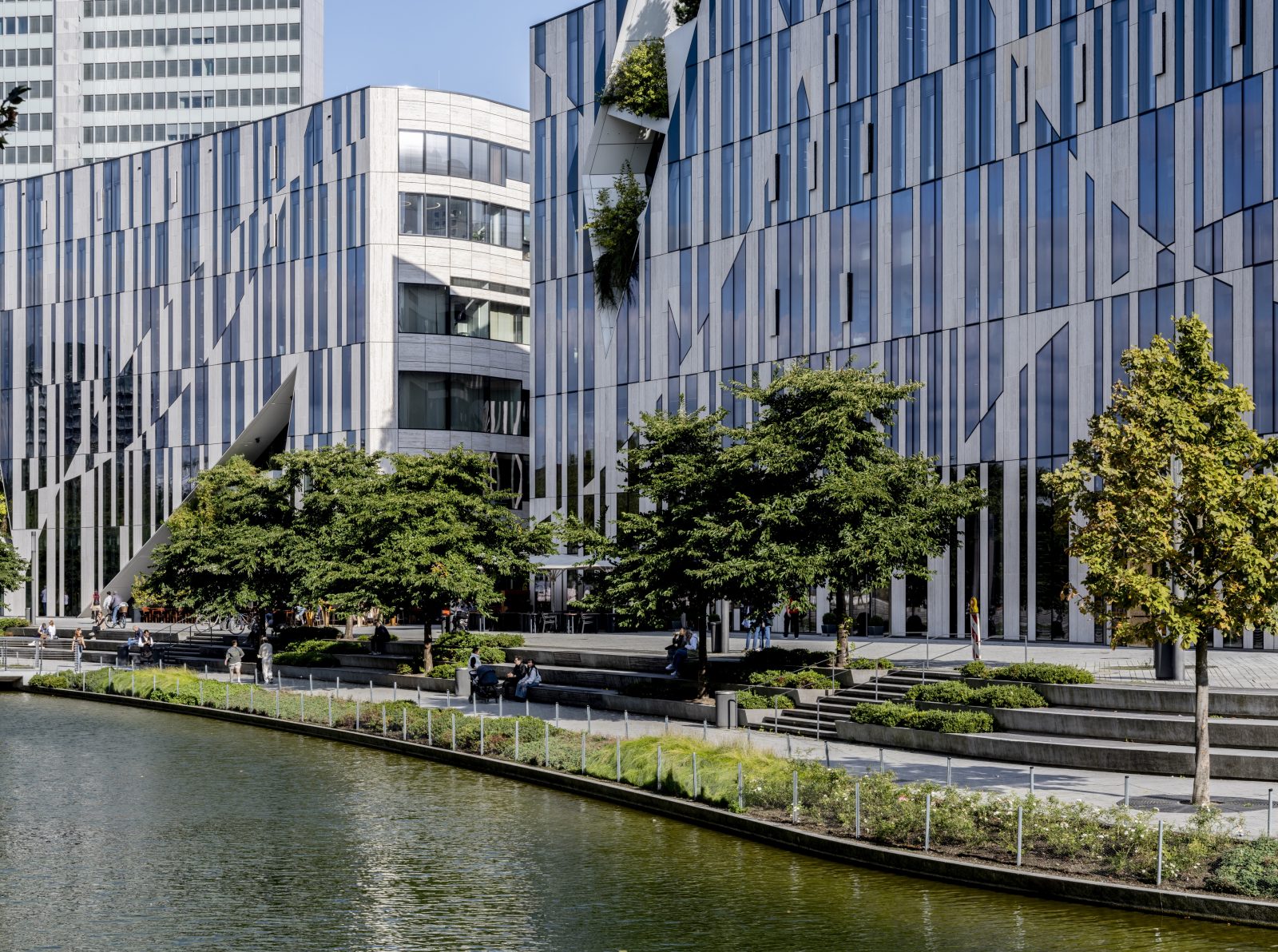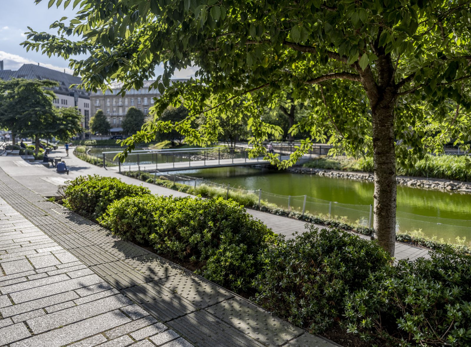 In den Böschungsbereichen entlang des Wassers werden die Rasenflächen in ganzjährig ansprechende Pflanzflächen aus Stauden, Gräsern und Sträuchern umgewandelt. Dabei wurden insbesondere auf die abweisende Wirkung für die Wasservögel mit entsprechenden Arten berücksichtigt. Auf der Hofgartenseite werden weiterhin ergänzende Kirschbäume, analog zur Kö-Bogen-Seite, gepflanzt. Die Pflanzbereiche werden jeweils mit entsprechenden niedrigen, in die Pflanzung integrierten Zäune vor Betreten geschützt, die im eingewachsenen Zustand kaum mehr sichtbar sein werden.
