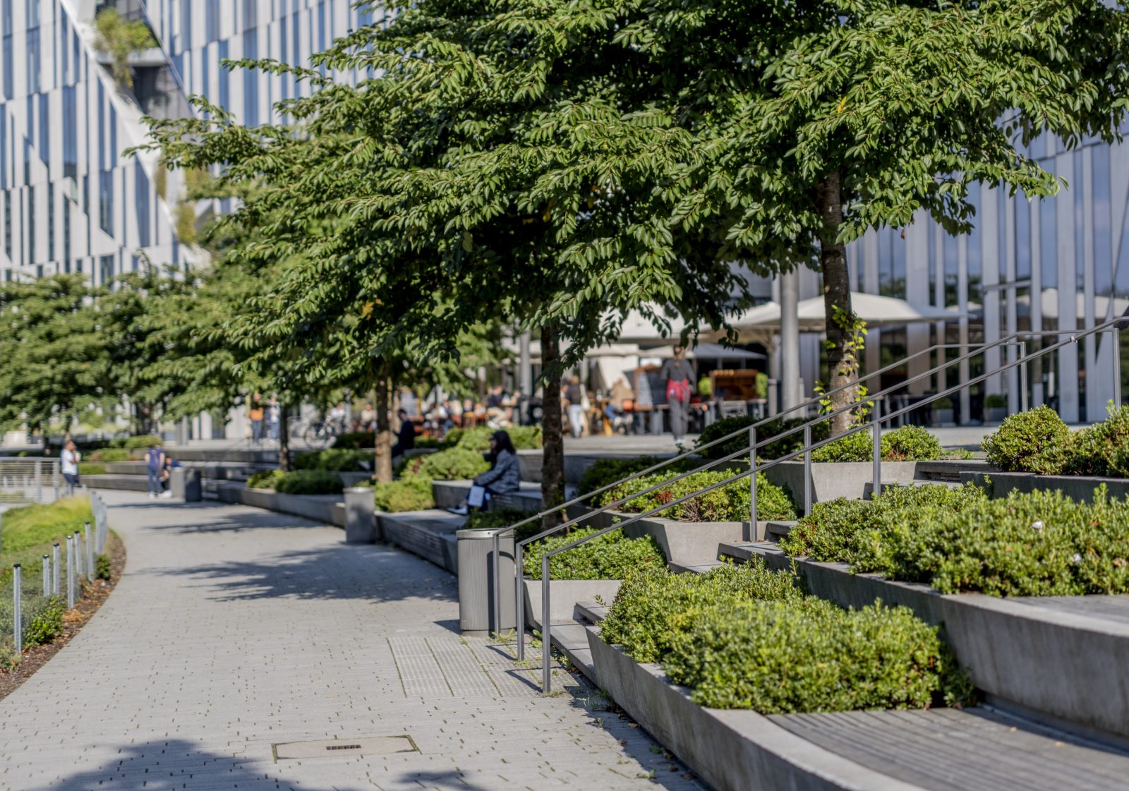 Mit der Überarbeitung entfallen die Rasenflächen im Bereich der Böschungen an der Landskrone sowie die Rasenstufen auf Kö-Bogenseite. Die Rasenterrassen werden zugunsten erweiterter Sitzflächen aus Holz, analog zu bereits bestehenden Sitzplatzangeboten umgewandelt. Im Bereich der Bestandskirschen werden Pflanzflächen einheitlich mit einer interessanten und zugleich robusten Rhododendronzüchtung unterpflanzt.