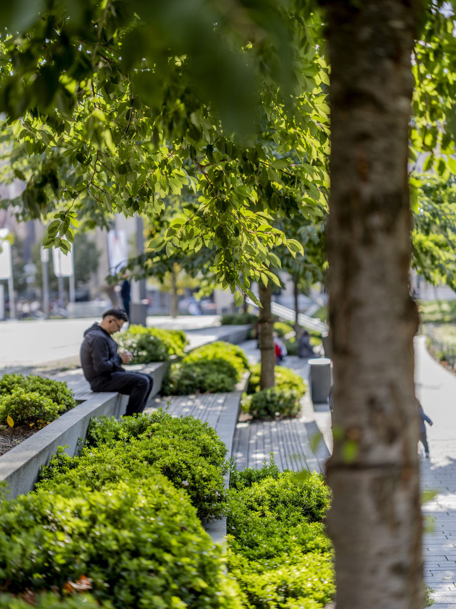 Mit der Überarbeitung entfallen die Rasenflächen im Bereich der Böschungen an der Landskrone sowie die Rasenstufen auf Kö-Bogenseite. Die Rasenterrassen werden zugunsten erweiterter Sitzflächen aus Holz, analog zu bereits bestehenden Sitzplatzangeboten umgewandelt. Im Bereich der Bestandskirschen werden Pflanzflächen einheitlich mit einer interessanten und zugleich robusten Rhododendronzüchtung unterpflanzt.