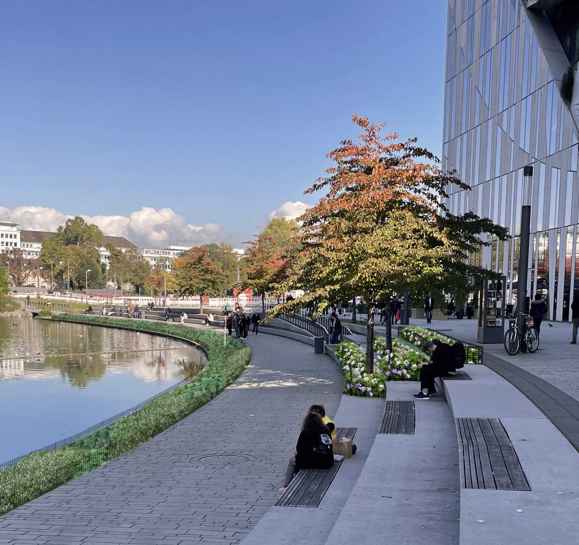 In den Böschungsbereichen entlang des Wassers werden die Rasenflächen in ganzjährig ansprechende Pflanzflächen aus Stauden, Gräsern und Sträuchern umgewandelt. Dabei wurden insbesondere auf die abweisende Wirkung für die Wasservögel mit entsprechenden Arten berücksichtigt. Auf der Hofgartenseite werden weiterhin ergänzende Kirschbäume, analog zur Kö-Bogen-Seite, gepflanzt. Die Pflanzbereiche werden jeweils mit entsprechenden niedrigen, in die Pflanzung integrierten Zäune vor Betreten geschützt, die im eingewachsenen Zustand kaum mehr sichtbar sein werden.