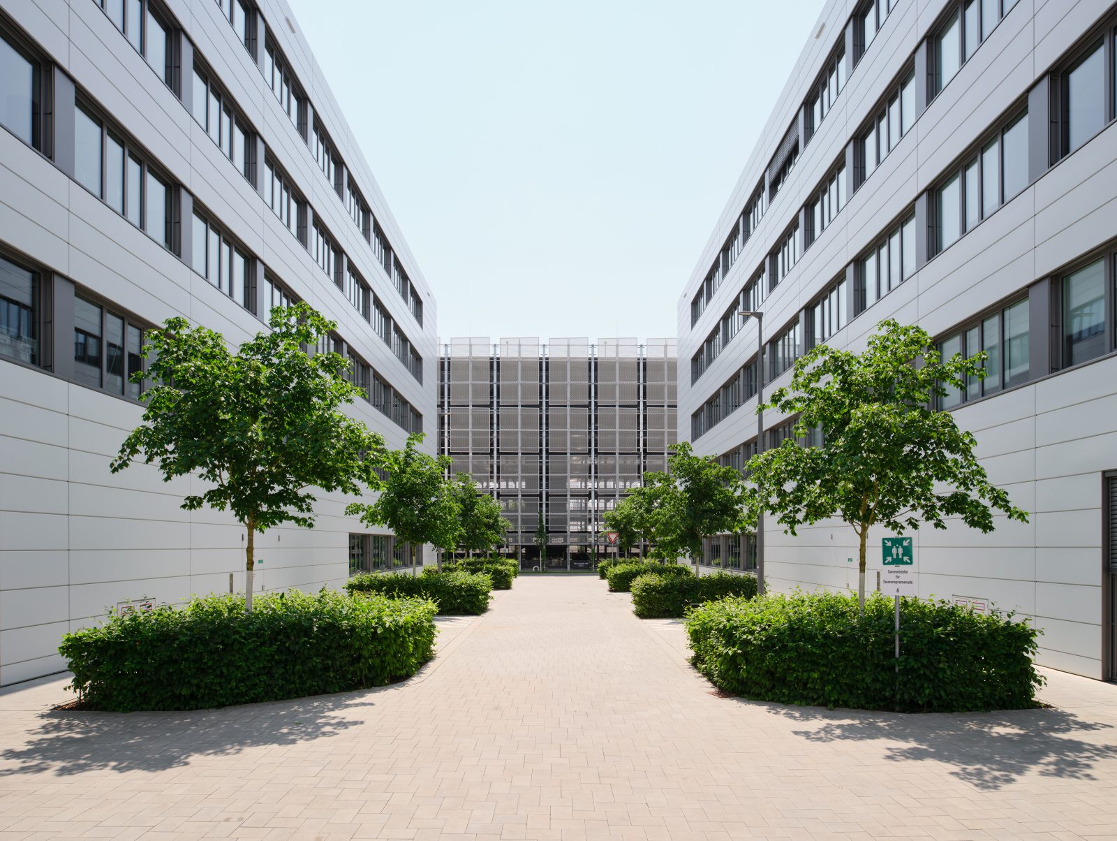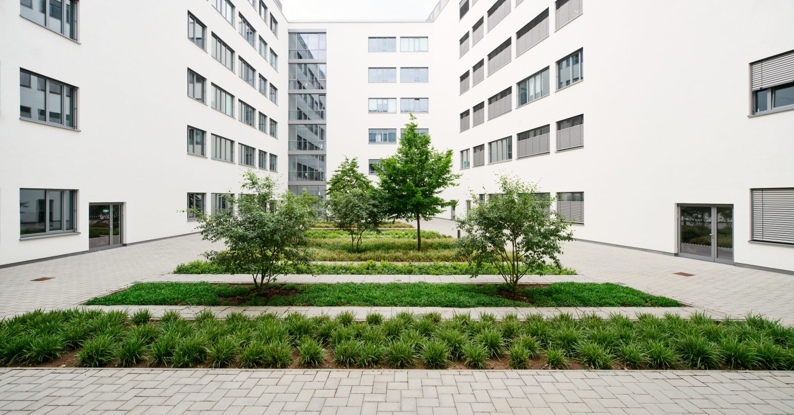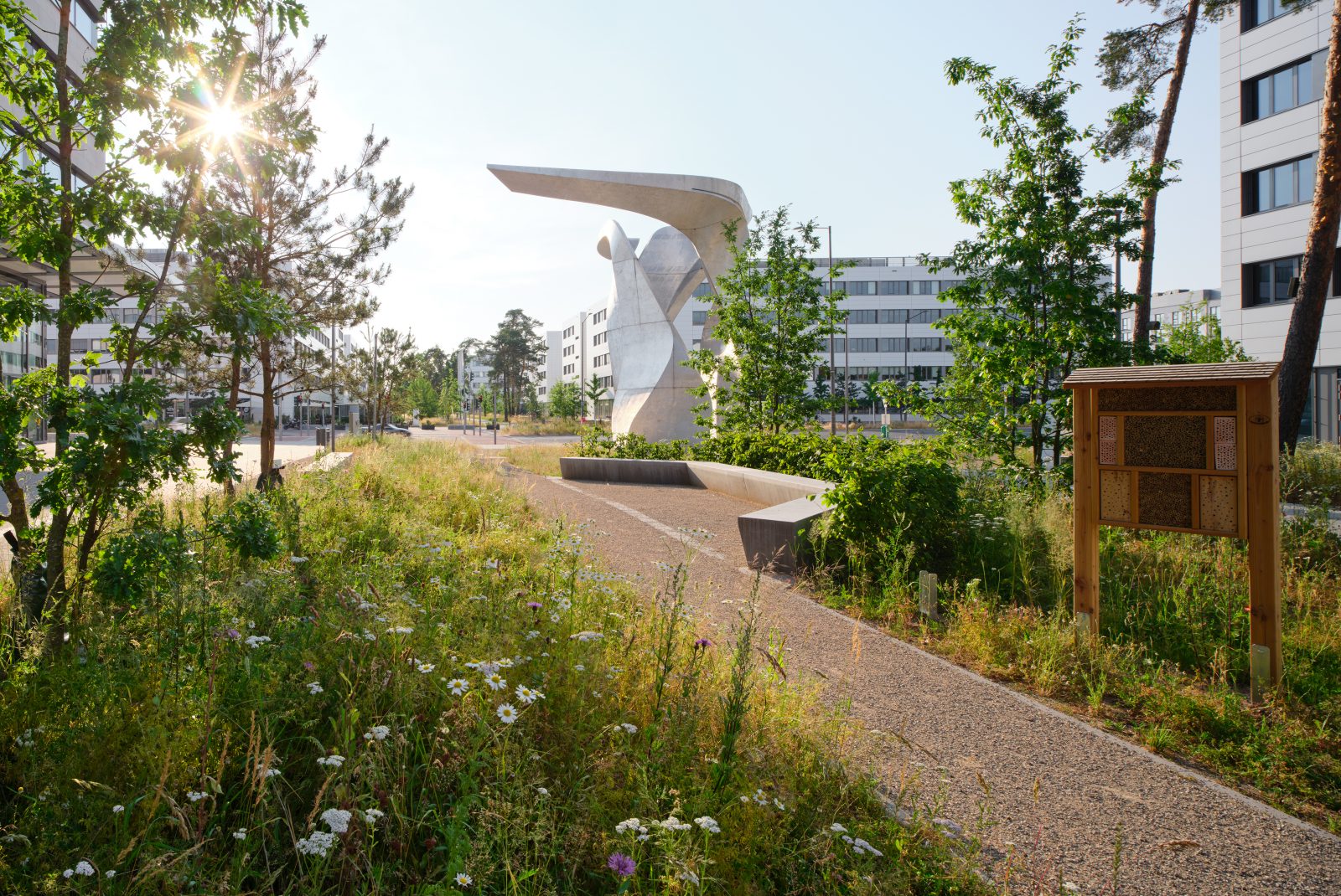 Mit unserem Entwurf wollen wir eine neue ganzjährig attraktive Stadt- und Freiraumstruktur schaffen und den Anforderungen an ein modernes Arbeitsumfeld gerecht werden. Besonderer Wert wurde auf die Integration der vorhandenen Baumsubstanz gelegt. Neben den „üblichen“ Anforderungen an einen Freiraum, wie die innere Vernetzung und die Ausbildung unterschiedlicher Freiraumstrukturen, wurde insbesondere auf einen hohen ökologischen Ansatz geachtet. Auf diesem neuen Campus findet man keine klassischen tradierten Rasenflächen, sondern extensive Wiesen mit Bodenmodellierungen zur Speicherung von Niederschlagswasser während Starkregenereignissen. Klimaresiliente und standorttypische Baum- und Straucharten strukturieren den Campus zusätzlich. Die Fauna findet zudem durch Trockenmauern, Insektenhotels, feuchte und trockene Bereiche einen zusätzlichen Rückzugsraum.