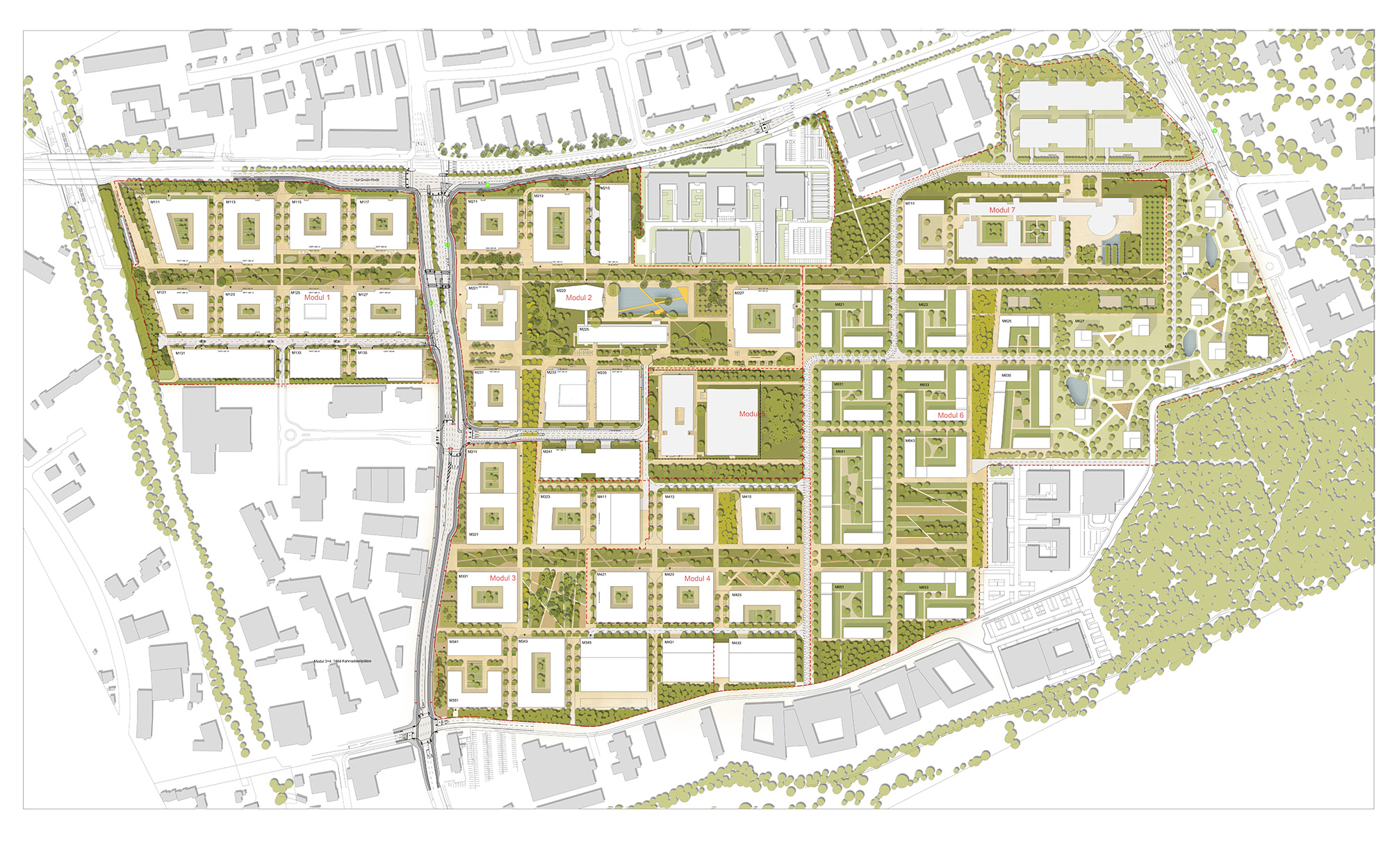 Neben der städtebaulichen Gestaltung kommt insbesondere dem Freiraum eine besondere Bedeutung zu. Durch die Ausbildung unterschiedlicher Grünachsen und deren Vernetzung entsteht ein neuer ganzheitlicher Grünraum mit hohem ökologischem Potenzial. Der Außenraum wird im neuen Campus zum zentralen Erlebnisraum und dient nicht nur der Vernetzung und dem Aufenthalt, sondern ist zugleich auch ein Ort der Kommunikation, des Spiels und der Erholung.