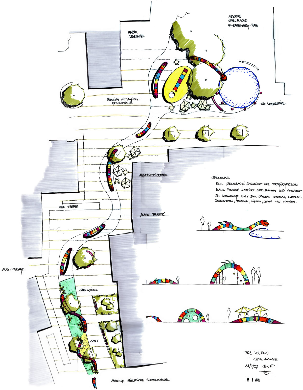 Zentrales Element unserer Neugestaltung ist die Spielschlange. Ein ca. 95 Meter langes und 80 Zentimeter dickes, vielfarbiges Edelstahlrohr schlängelt sich durch und über