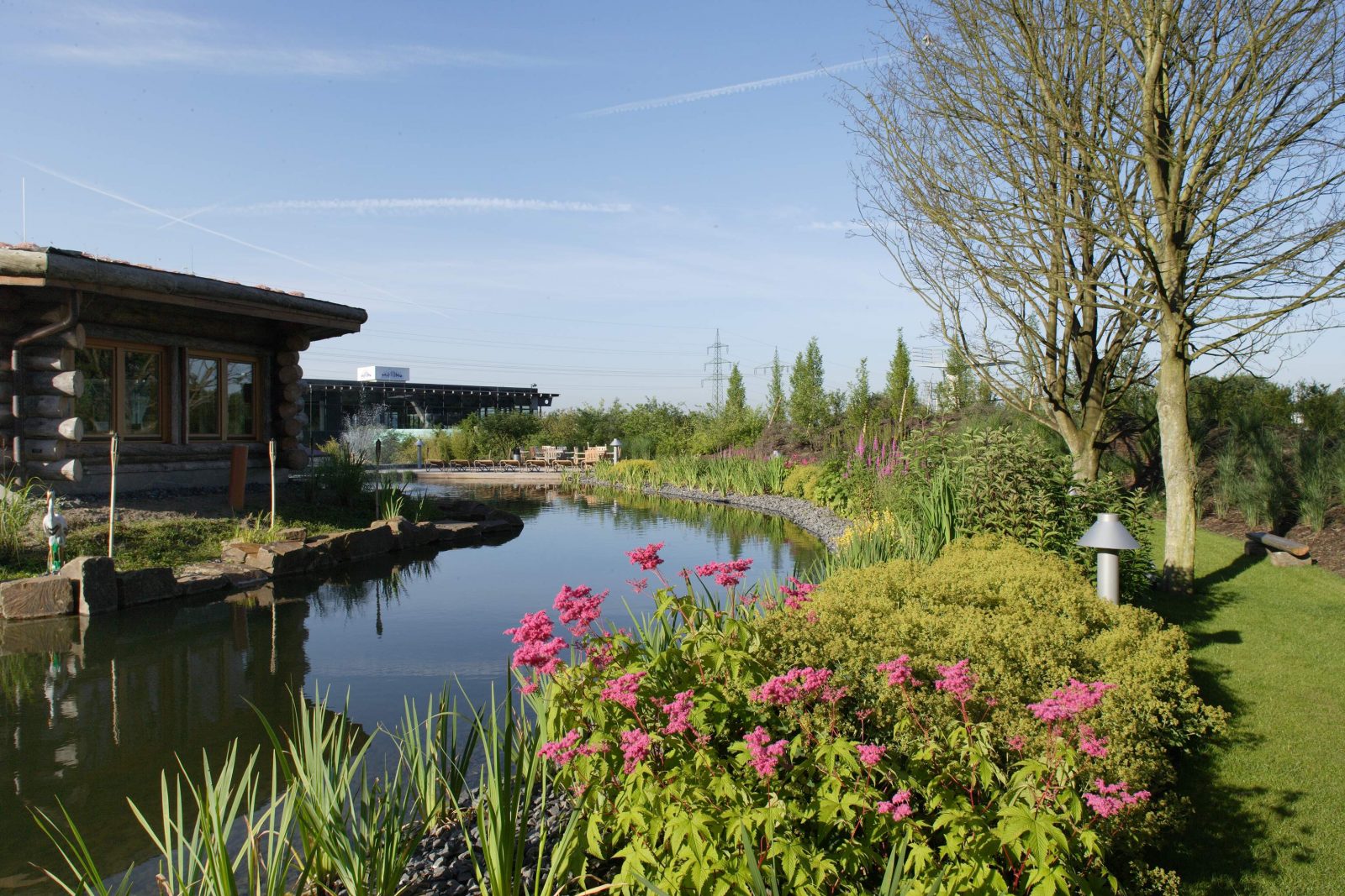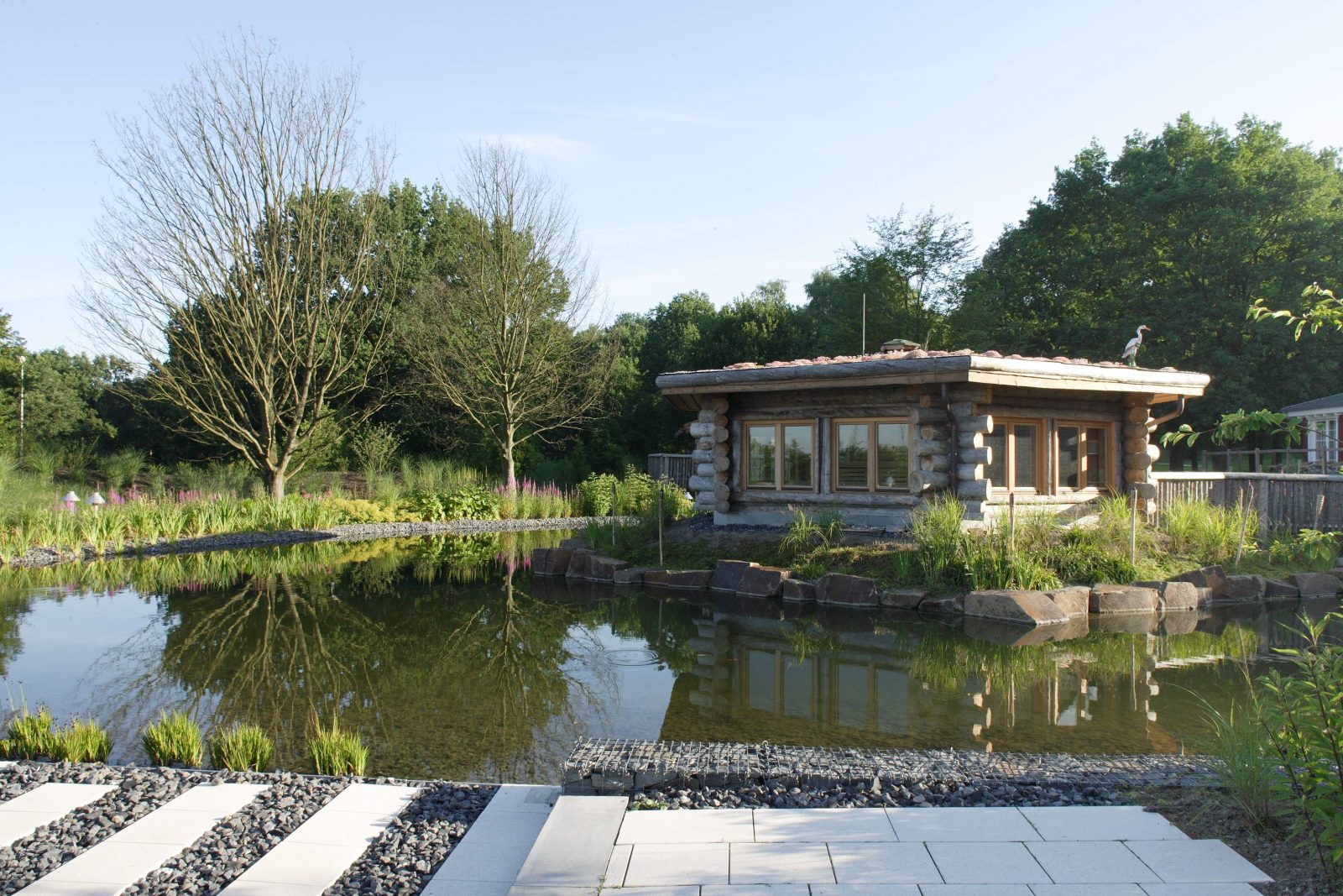 Jeder Außensauna haben wir einen eigenen Freiraum zugeordnet. Die Vielfalt aus farbigen Stauden, Bäumen und Gräsern, aus Natursteinen, Findlingen und Plattenbelägen animiert die Gäste zum Durchwandern und Entdecken der Orte und Saunen. Höhepunkt ist eine im See gelegene, von Wasserpflanzen und Schilf umgebene Panorasauna im Kronenbereich alter Eichen. Eher verborgen hinter einer Natursteinmauer liegt dagegen die Stollensauna.