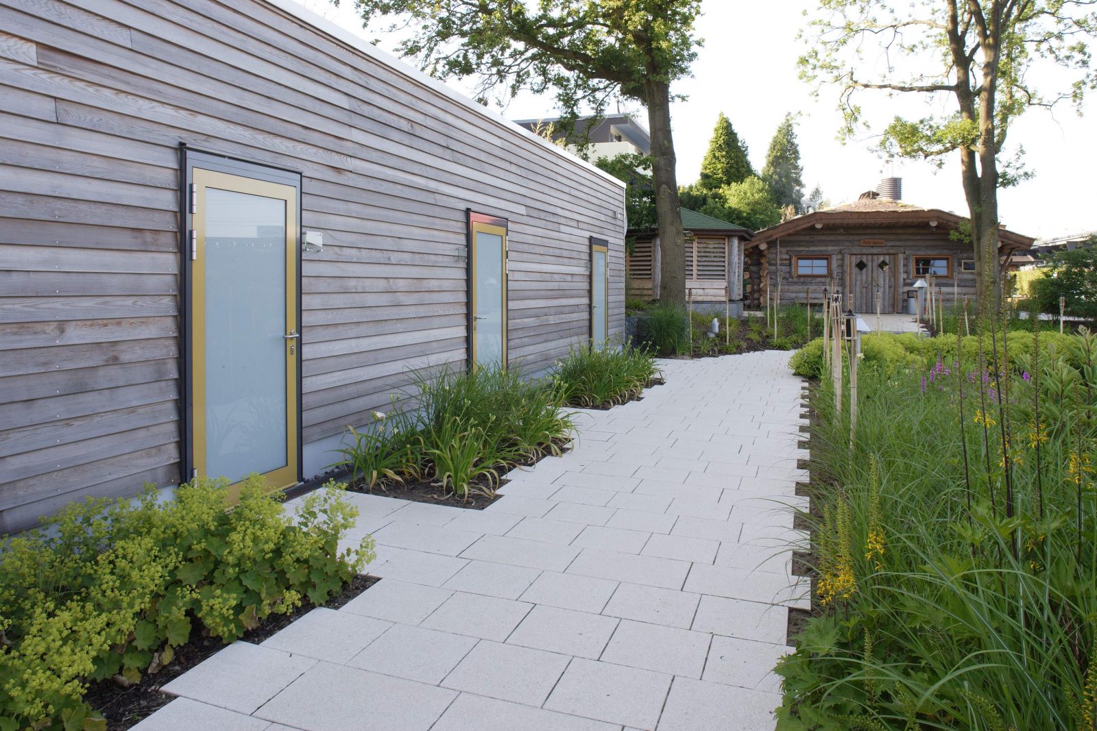 Jeder Außensauna haben wir einen eigenen Freiraum zugeordnet. Die Vielfalt aus farbigen Stauden, Bäumen und Gräsern, aus Natursteinen, Findlingen und Plattenbelägen animiert die Gäste zum Durchwandern und Entdecken der Orte und Saunen. Höhepunkt ist eine im See gelegene, von Wasserpflanzen und Schilf umgebene Panorasauna im Kronenbereich alter Eichen. Eher verborgen hinter einer Natursteinmauer liegt dagegen die Stollensauna.