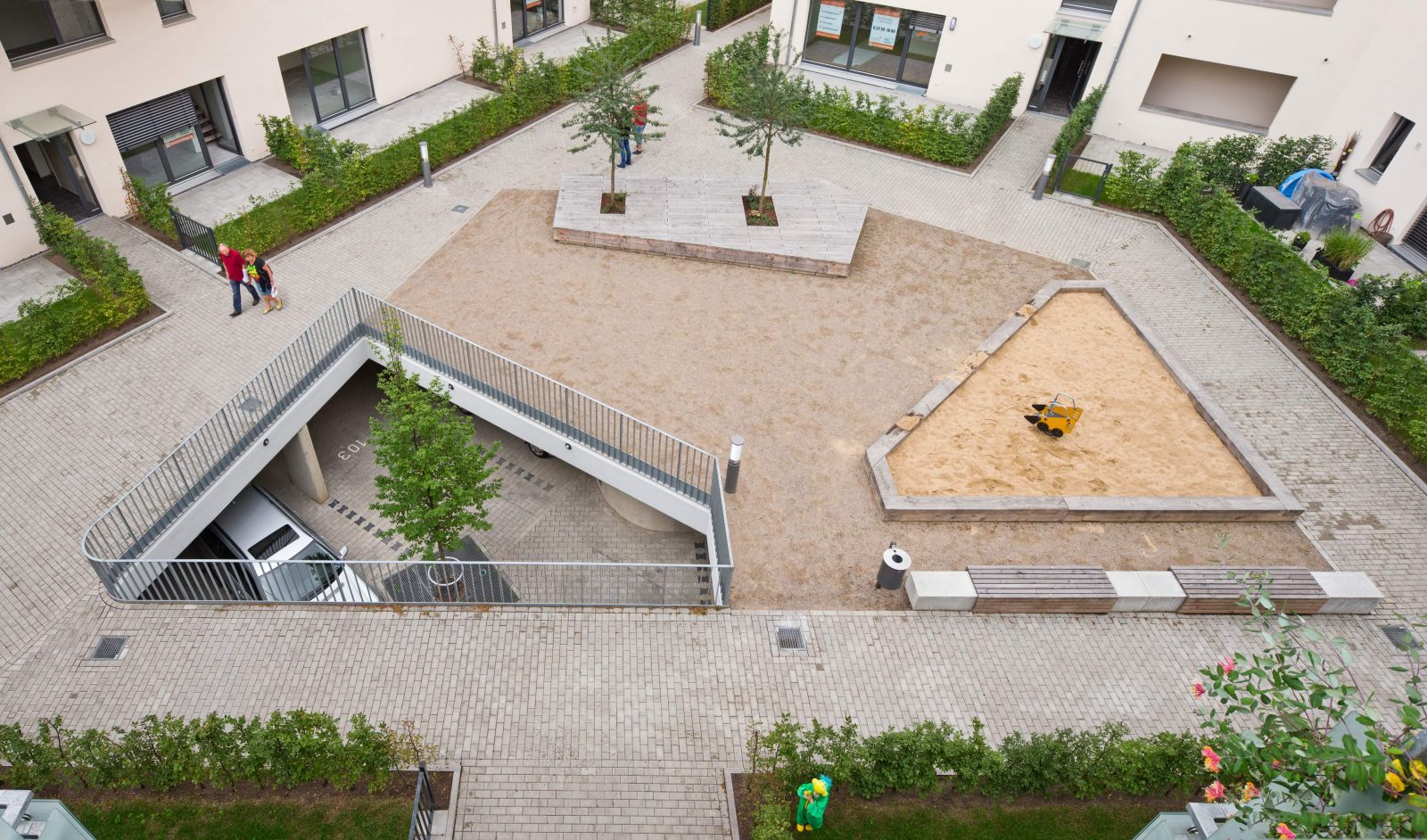 Im Innenhof der Wohnbebauung entsteht ein halböffentlicher Platz der ebenfalls mit hochwertigen Betonwerksteinen belegt wird und durch Bänke, ein großes Holzdeck und Spielmöglichkeiten ein hohes Maß an Entspannung und Nutzbarkeit bietet. Als Zugang von außen in den Innenhof dient eine angelegte Rampe. Highlight des Innenhofes ist der in der darunter liegenden Tiefgarage gepflanzte Ahorn, der durch einen großzügigen Deckendurchbruch mit seiner Krone mitten im Hof steht.