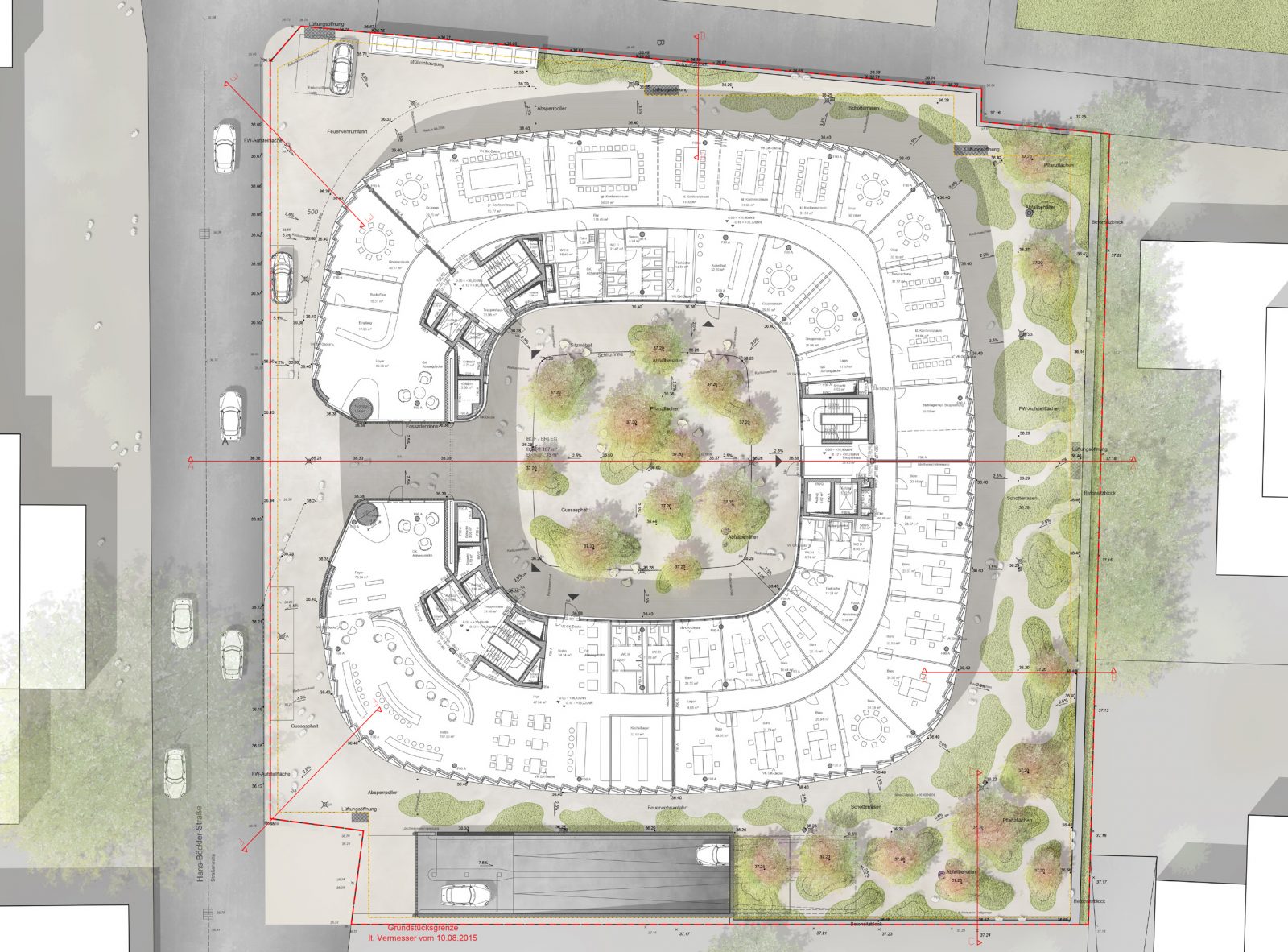 Alle befestigten Flächen erhalten einen einheitlichen Belag aus Betonsteinpflaster. Der öffentlichen Gehwegstreifen an der Westseite wird gepflastert, analog der Zufahrtsstraße. Die Solitär-Sträucher werden von unten mit einem Bodenstrahler beleuchtet. Pollerleuchten sind für die Zufahrten und Fluchtwege im Innenhof vorgesehen.