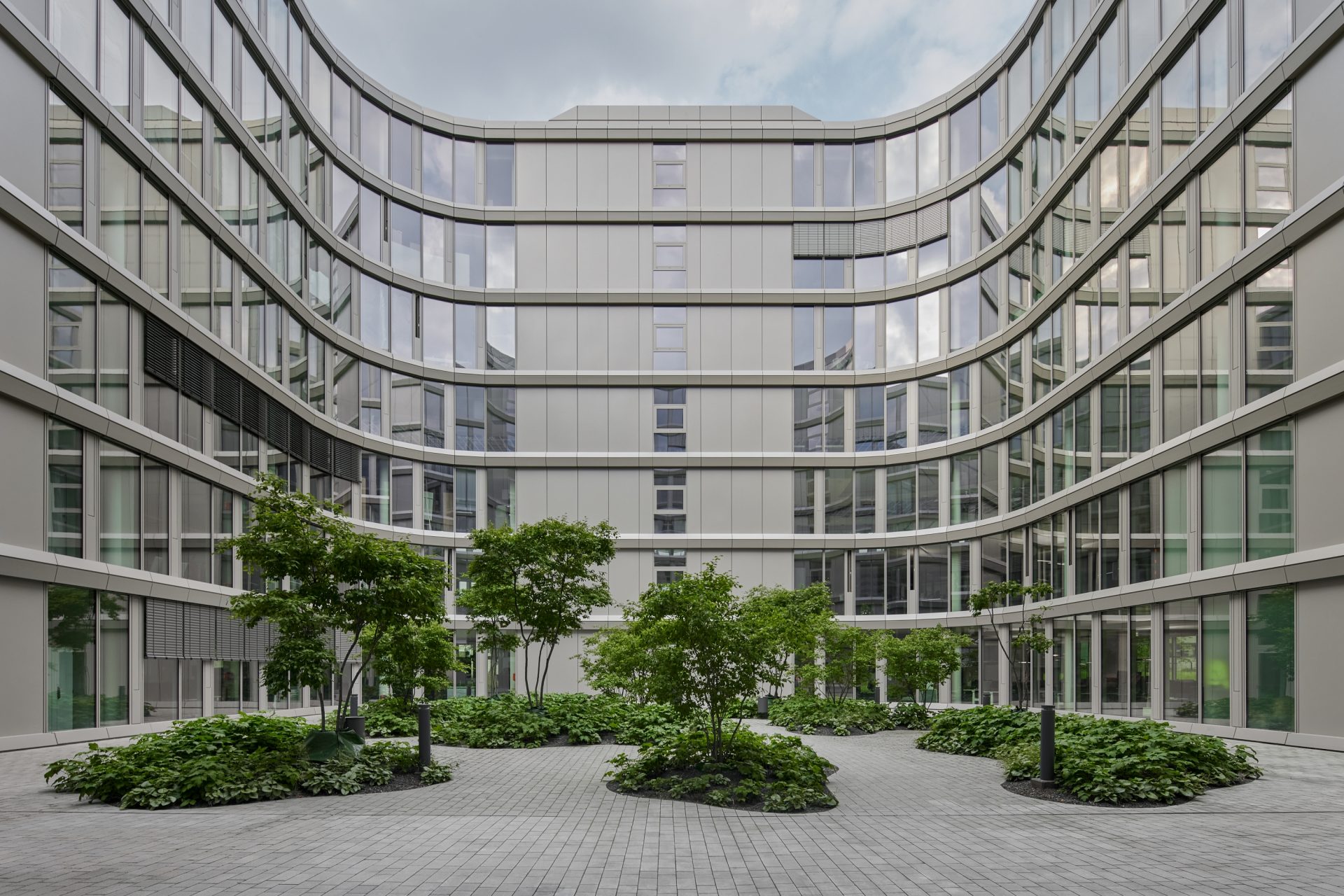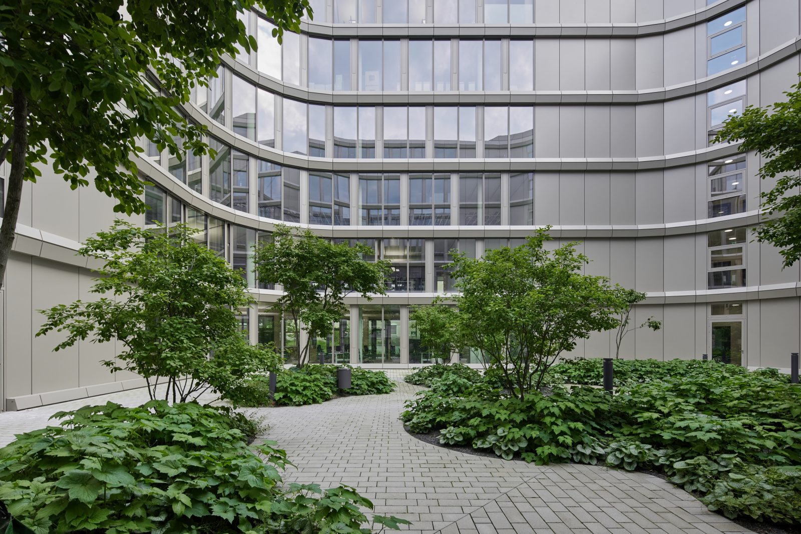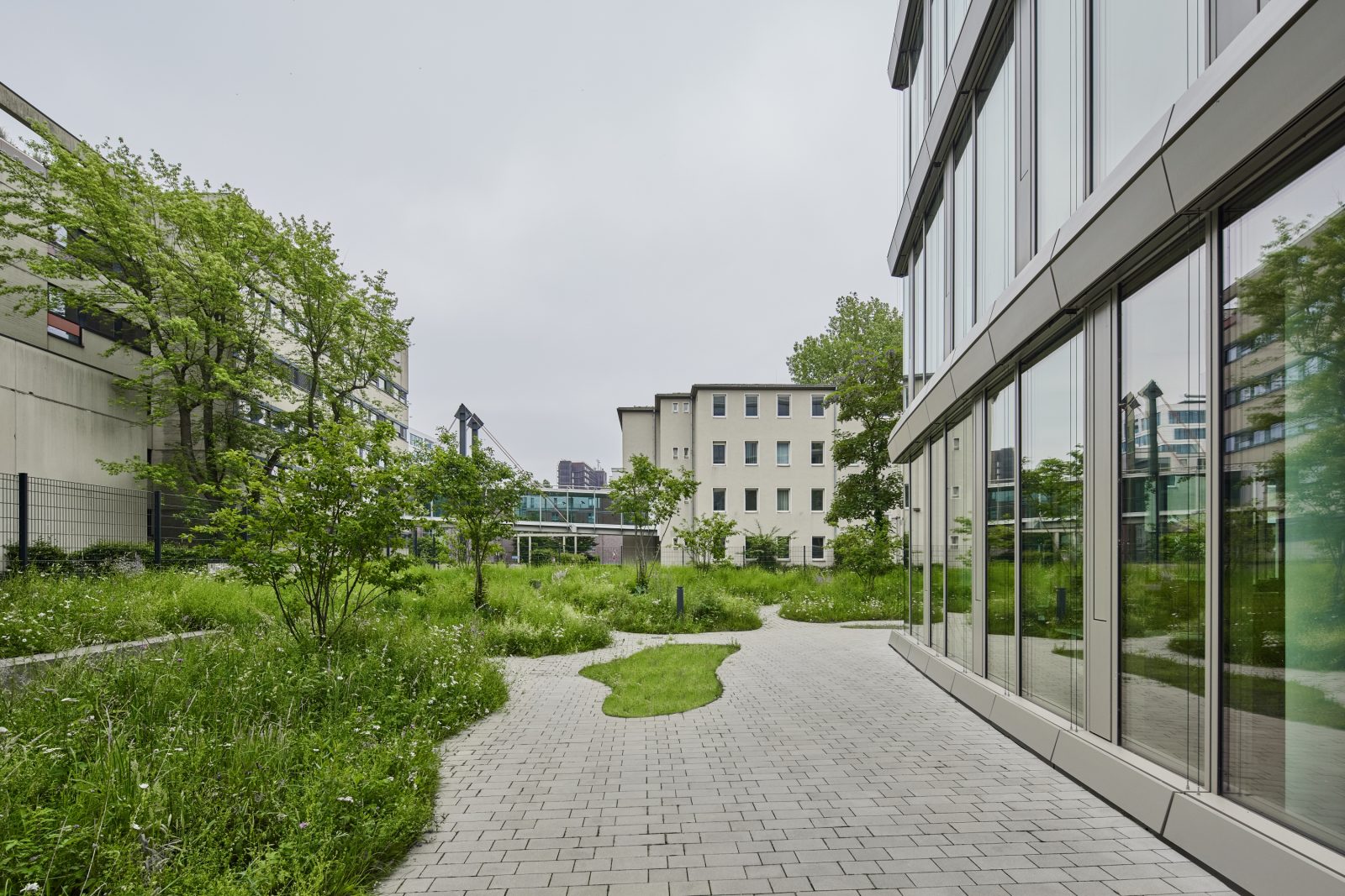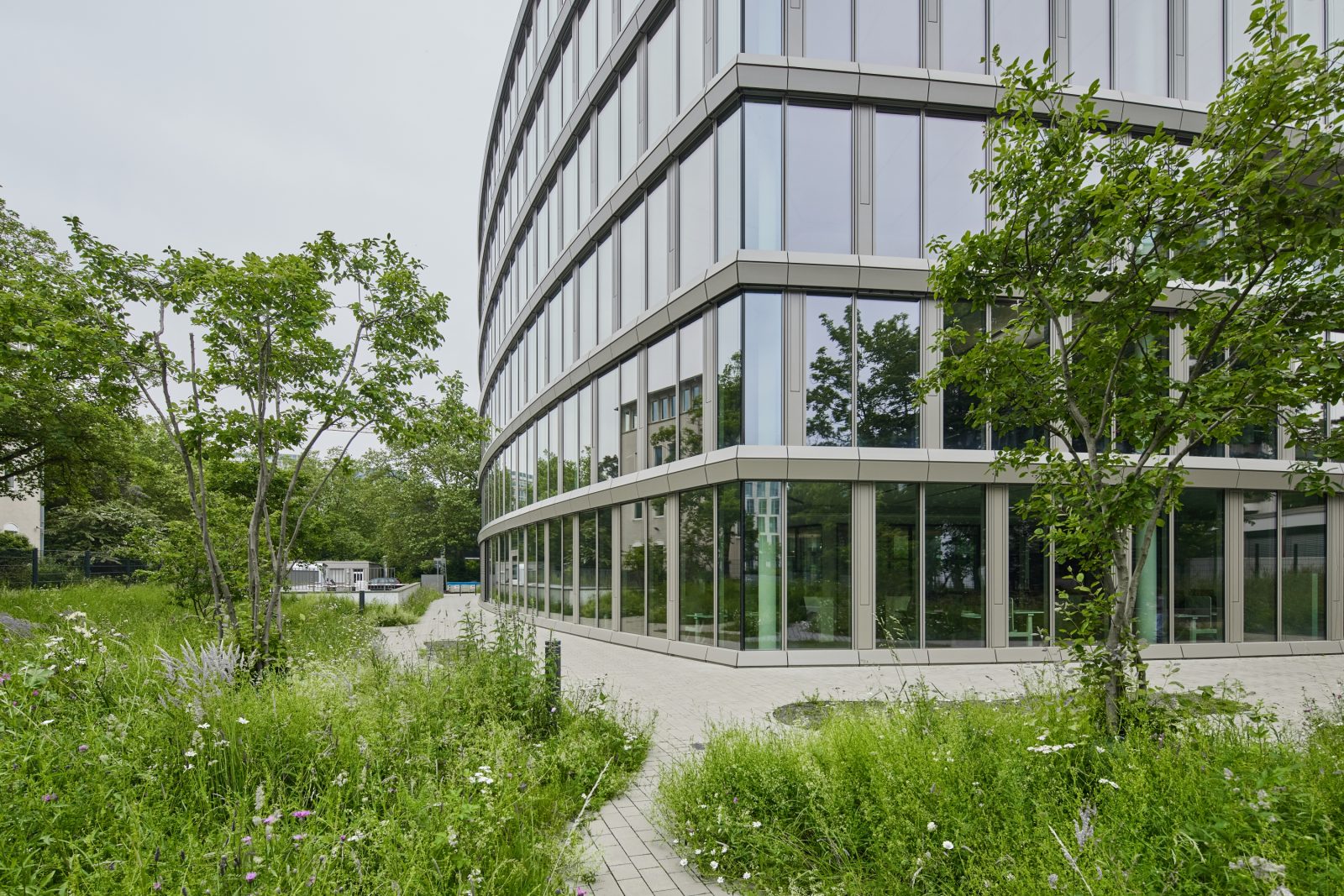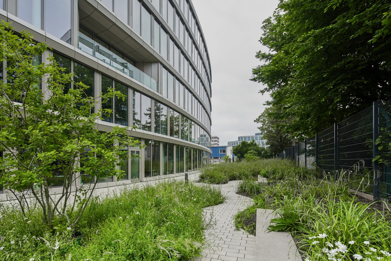 In den Außenanlagen der Hans-Böckler-Straße 33 inszenieren mäanderartige Pflanzinseln, mal als leichter Hügel, mal als kleine Mulde oder als ebene Fläche den Raum. Sie geben ihm Rhythmus und Halt, bieten abwechslungsreiche Aus- und Einblicke. Schirmförmig geschnittene, hohe Felsenbirnen als Solitärsträucher schaffen mit ihrer Blüte, ihrem Habitus und ihrer Herbstfärbung einzigartige Momente im Arbeitsalltag.