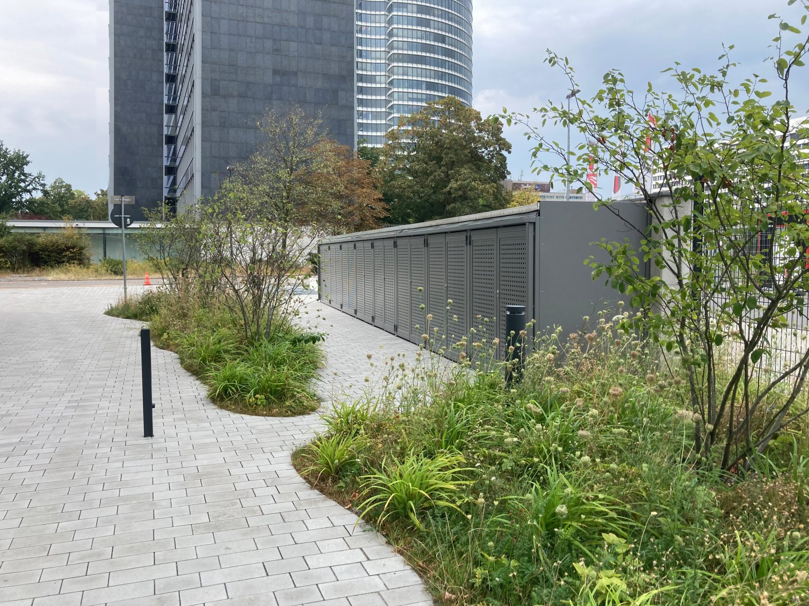 Im Innenhof werden die Pflanzeninseln mit Kaukasusvergissmeinnicht unterpflanzt. Deren silbriges Laub setzt zusätzliche fröhliche Akzente im Hof. Im Außenbereich werden die Pflanzinseln abwechslungsreich mit Gräsern und extensiven Stauden begrünt. Generell werden Arten und Sorten ausgewählt, die mit den Klimaverhältnissen gut zu Recht kommen. Der Pflege- und Bewässerungsaufwand steht in einem günstigen Verhältnis.