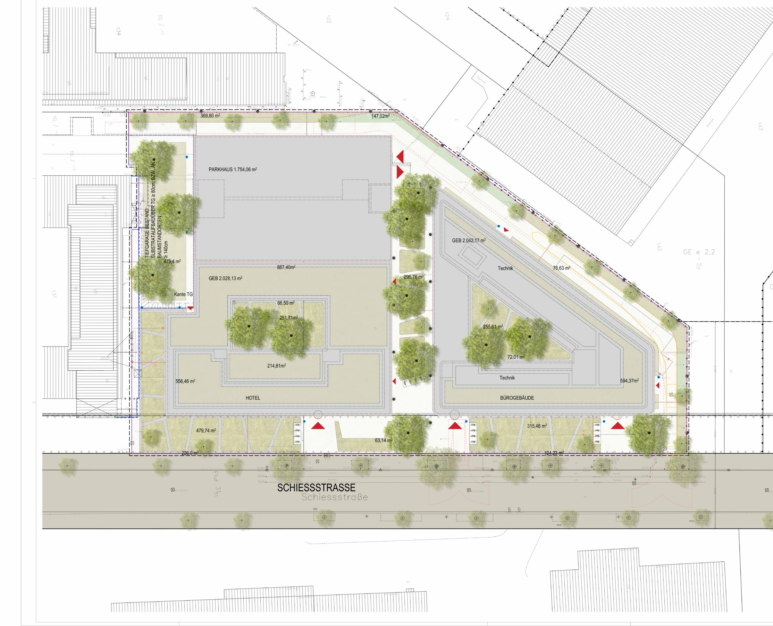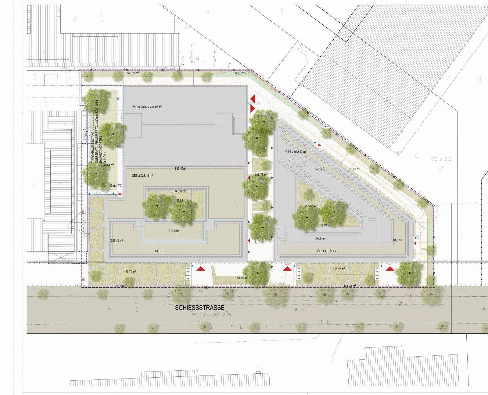 Die Haupteingänge und Notausgänge zur Schiessstrasse werden über ein zweites Wegeband erschlossen, welches eine bessere Anbindung der beiden Hotelmarken zum Parkhaus sicherstellt. Die sich auf diesen Flächen befindlichen Grüninseln bekommen einen, den architektonischen Nutzungen entsprechenden, hochwertigen und durchlässigen Charakter. Laubbäume werden locker in die Grüninseln auf den grünen Bändern eingestreut. Niedrige Bepflanzung aus Bodendeckern trennt die höher bepflanzten Beetflächen mit Stauden und Gräsern voneinander. Konsequenterweise werden auch die Grüninseln im 10 m Band entlang der Schiessstraße im gleichen Gestaltungsbild wie die übrigen dekorativen Beetflächen gehalten, wobei in diesem Bereich auch heimische Gehölze verwendet werden.