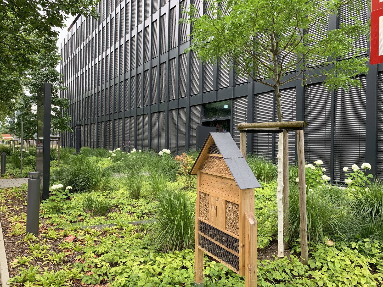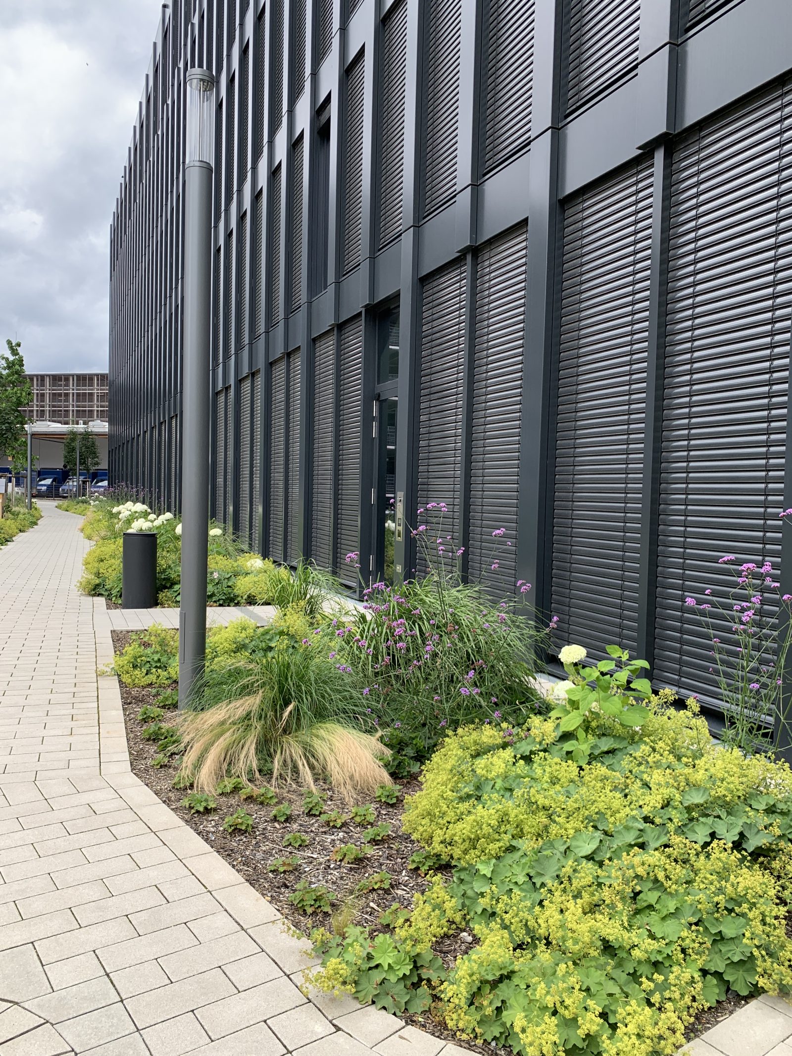 Die übrigen Wege- und Erschließungsflächen werden einheitlich für Fußgänger, Lieferverkehr und Feuerwehr gepflastert. Der Anlieferungsbereich des Hotels wird hinsichtlich eines immergrünen vegetativen Sichtschutzes in Form von Hecken und einer berankten Pergola aufgewertet. Ein eingegrünter Verbindungsweg dient dem Abtransport der Müllcontainer des Hotels zur Schiessstrasse. Die Müllaufstellfläche für das Bürogebäude ist in einer eingegrünten Müllbox mit Pergolendach nachgewiesen.