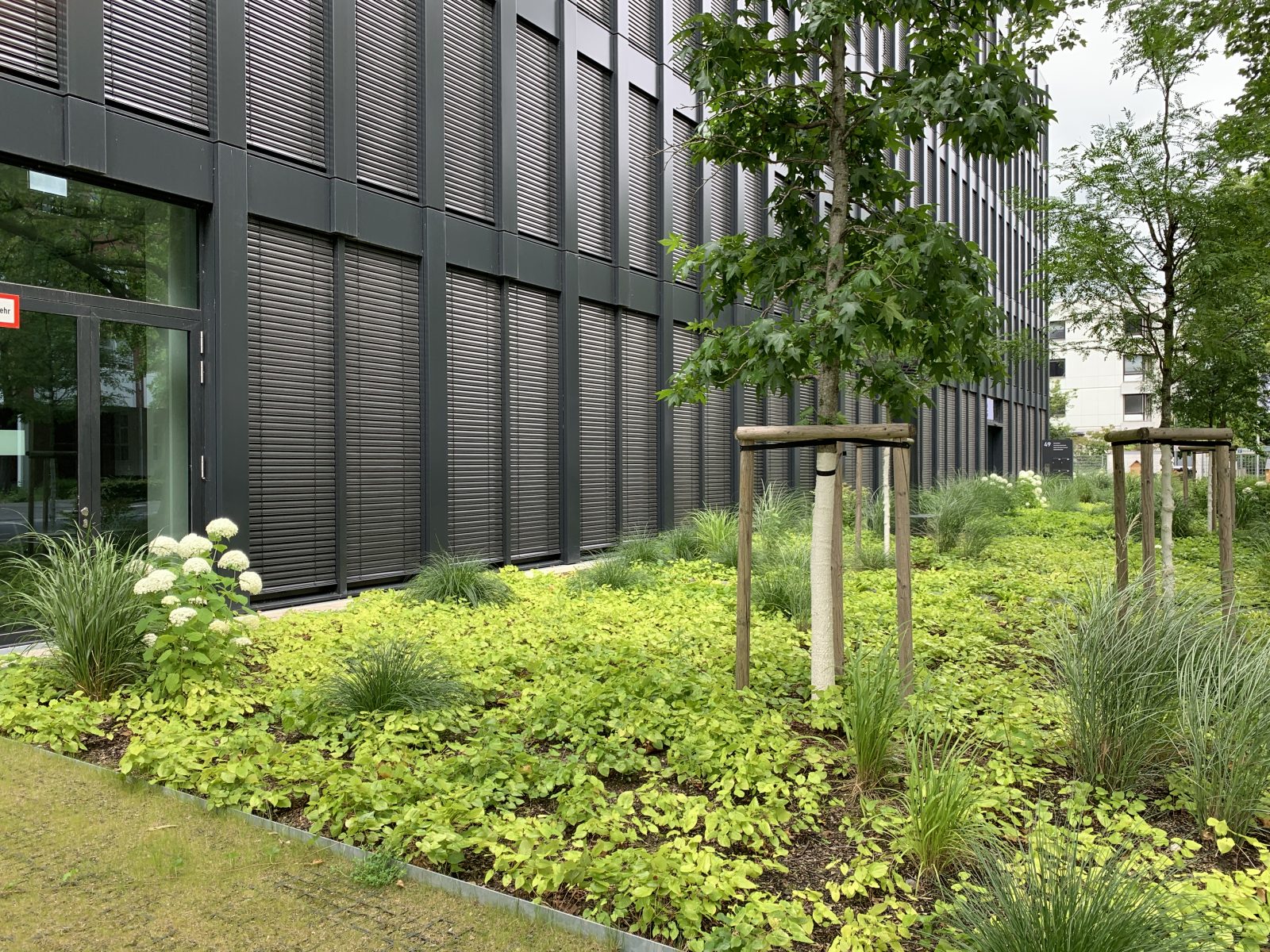 Das Bild der Grünflächen greift spielerisch die Formsprache der geplanten Baukörper von Hotel und Bürogebäude bzw. die geometrische Form des Grundstücks auf. Unter Berücksichtigung funktionaler Belange wie Erschließung und brandschutztechnischer Erfordernisse wird bewusst die Flächenversieglung reduziert.