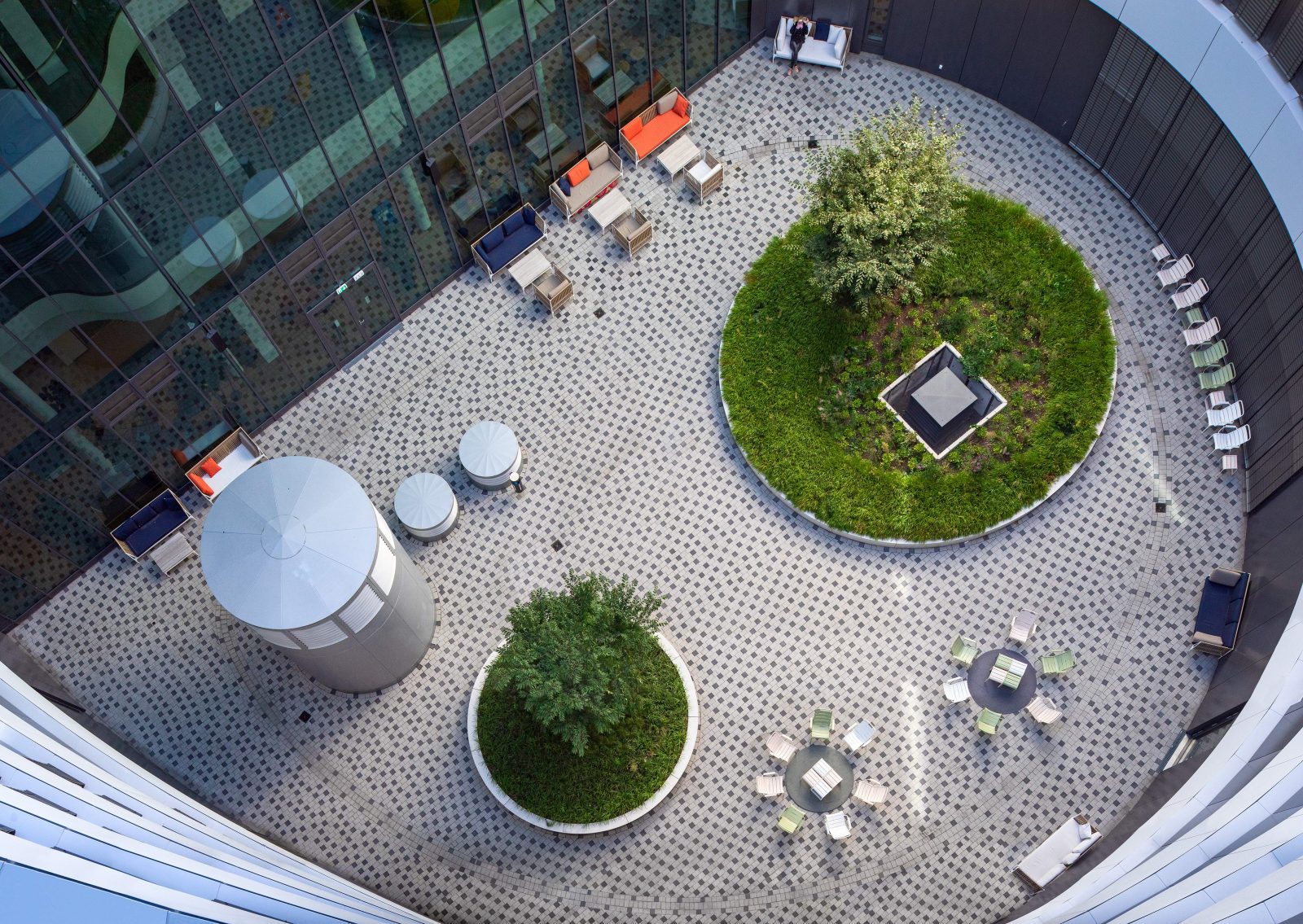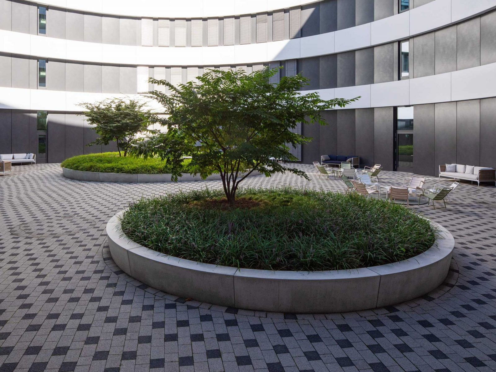 Kreisförmige Hochbeete mit schattenverträglichen Gräsern und mehrstämmigen Gehölzen bringen sattes Grün mit saisonalen Farbakzenten in die Innenhöfe. Stühle, Tische und gepolsterte Bänke laden zum Verweilen ein.